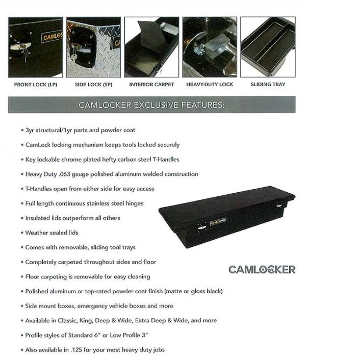 If you're looking for the most secure way to store your gear, look no further. Unlike most tool boxes on the market that use a low-grade metal paddle locks, the CamLocker system uses revolving cams that hook through welded catches to secure the box in the closed position. Breaking in without a key would actually require the lid to be broken or the use of power tools! CamLocker tool boxes are constructed from .063 gauge polished Aluminum for strength and rigidity, so when you leave your truck you can feel confident that your tools, firearms, or gear will still be there when you get back.