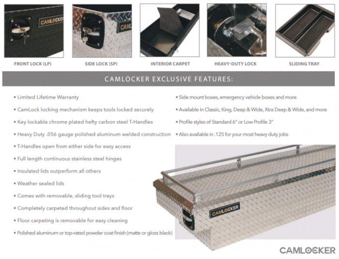 If you're looking for the most secure way to store your gear, look no further. Unlike most tool boxes on the market that use a low-grade metal paddle locks, the CamLocker system uses revolving cams that hook through welded catches to secure the box in the closed position. Breaking in without a key would actually require the lid to be broken or the use of power tools! CamLocker tool boxes are constructed from .063 gauge polished Aluminum for strength and rigidity, so when you leave your truck you can feel confident that your tools, firearms, or gear will still be there when you get back.