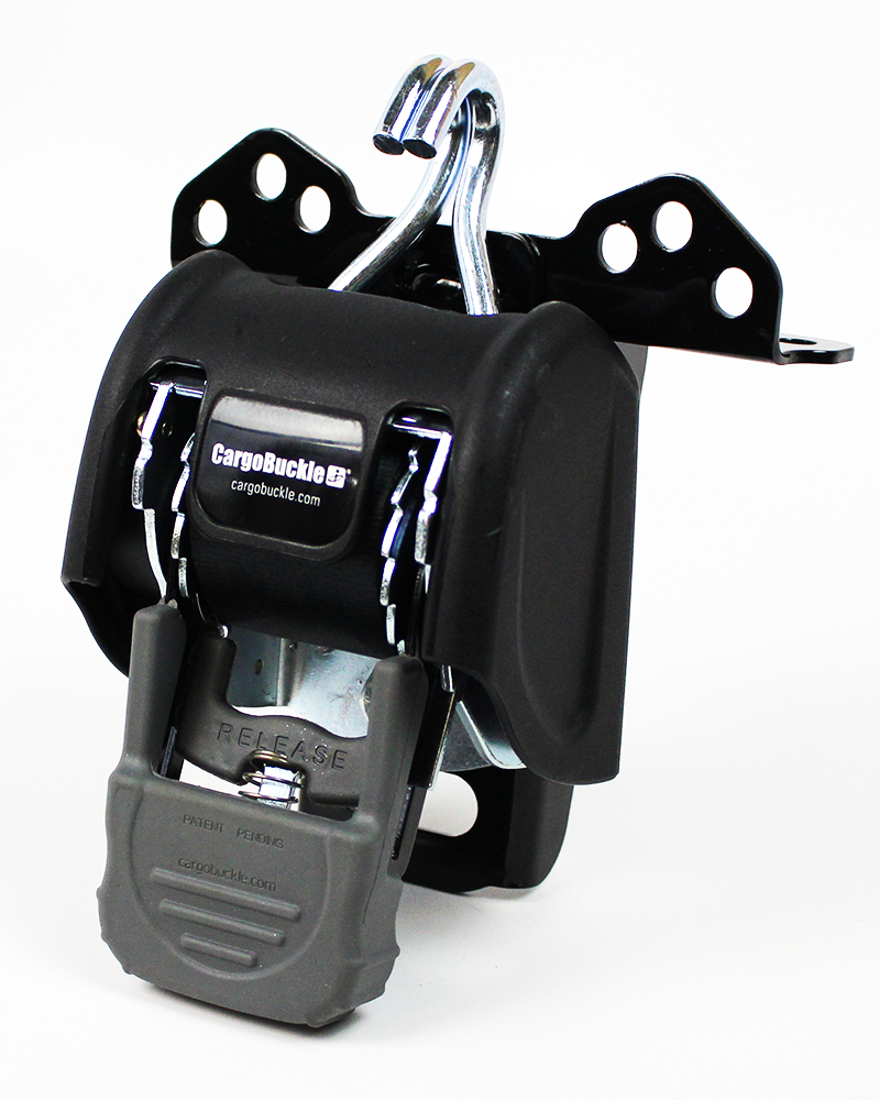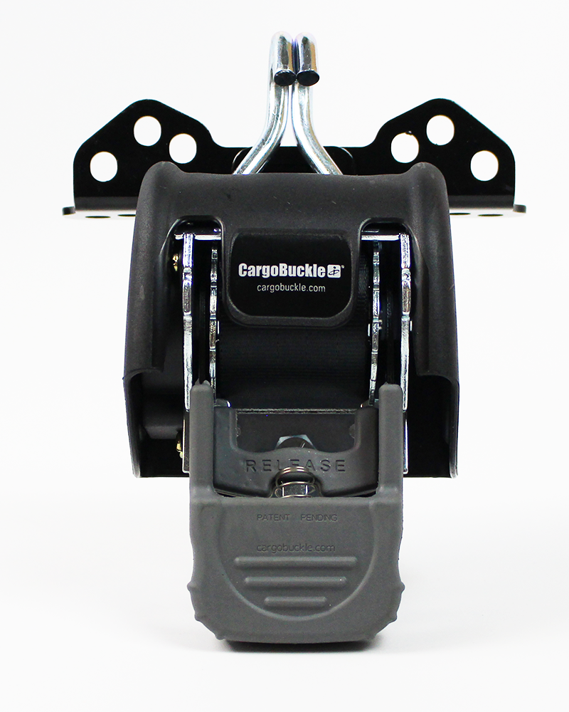 Ladder rack users can permanently mount the CargoBuckle Ladder Rack Tie-Down System to their truck racks. Valuable equipment is held securely with 7 feet of professional quality 2″ web and a strong double J-hook. The strap automatically retracts out of your way when not in use. The Ladder Rack Tie-Down System includes the CargoBuckle Retractable Ratcheting Tie-Down, the ladder rack universal mount adapter and mounting hardware.