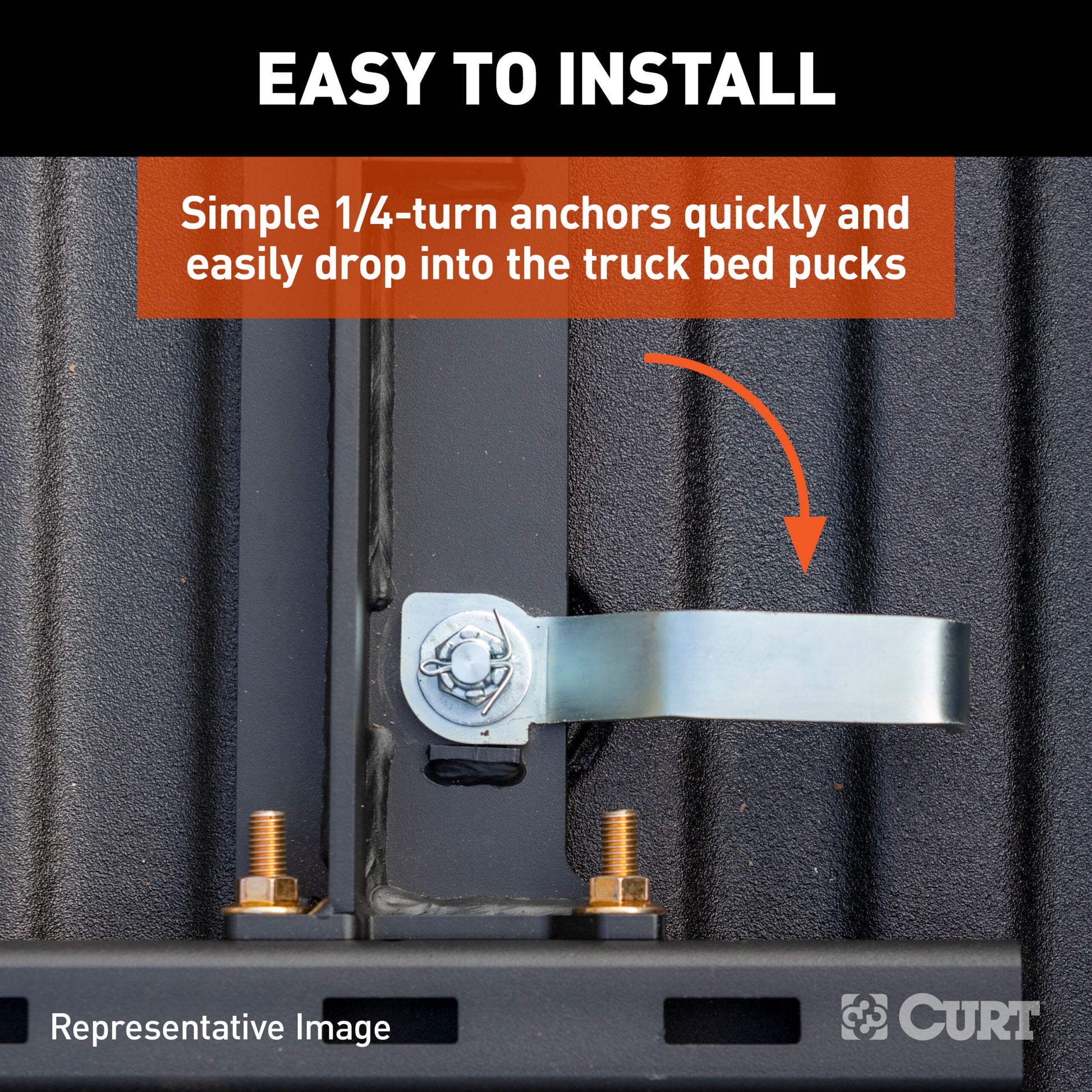 The CURT OEM puck system 5th wheel adapter for Ram pickups combines the functionality of CURT 5th wheel puck system products with the strength and convenience of the truck bed puck system. The adapter provides a set of industry-standard 5th wheel rails to securely mount a CURT 5th wheel hitch or roller into the bed of your truck. It is designed to fit select model years of the Ram 2500 and 3500 (see application info to verify fitment). It features a set of adjustable, quarter-turn anchors to quickly and easily drop into the pucks and provide a moveable platform for the 5th wheel coupling point. This puck system adapter requires a specific puck system for installation (year range specific). It features a capacity of 25,000 lbs. and is compatible with all CURT 5th wheel legs and rollers (weight capacities are limited to the lowest-rated towing component). Like our other OEM puck system 5th wheel products, the key feature of the 5th wheel puck system adapter is its quarter-turn anchors. With the hitch initially bolted onto the adapter, the adapter can easily be dropped into place whenever needed and secured with the quarter-turn anchors. The anchors can also be adjusted to help eliminate chucking noises between the adapter and under-bed platform while towing. When you are finished towing, simply turn the anchors to remove the entire assembly within seconds. The CURT 5th wheel adapter for select Ram pickup trucks provides the ultimate in versatility for the CURT 5th wheel line. It tested for safety in accordance with SAE J2638 and is coated in a highly durable carbide black powder coat finish to protect against scratches and rust.
