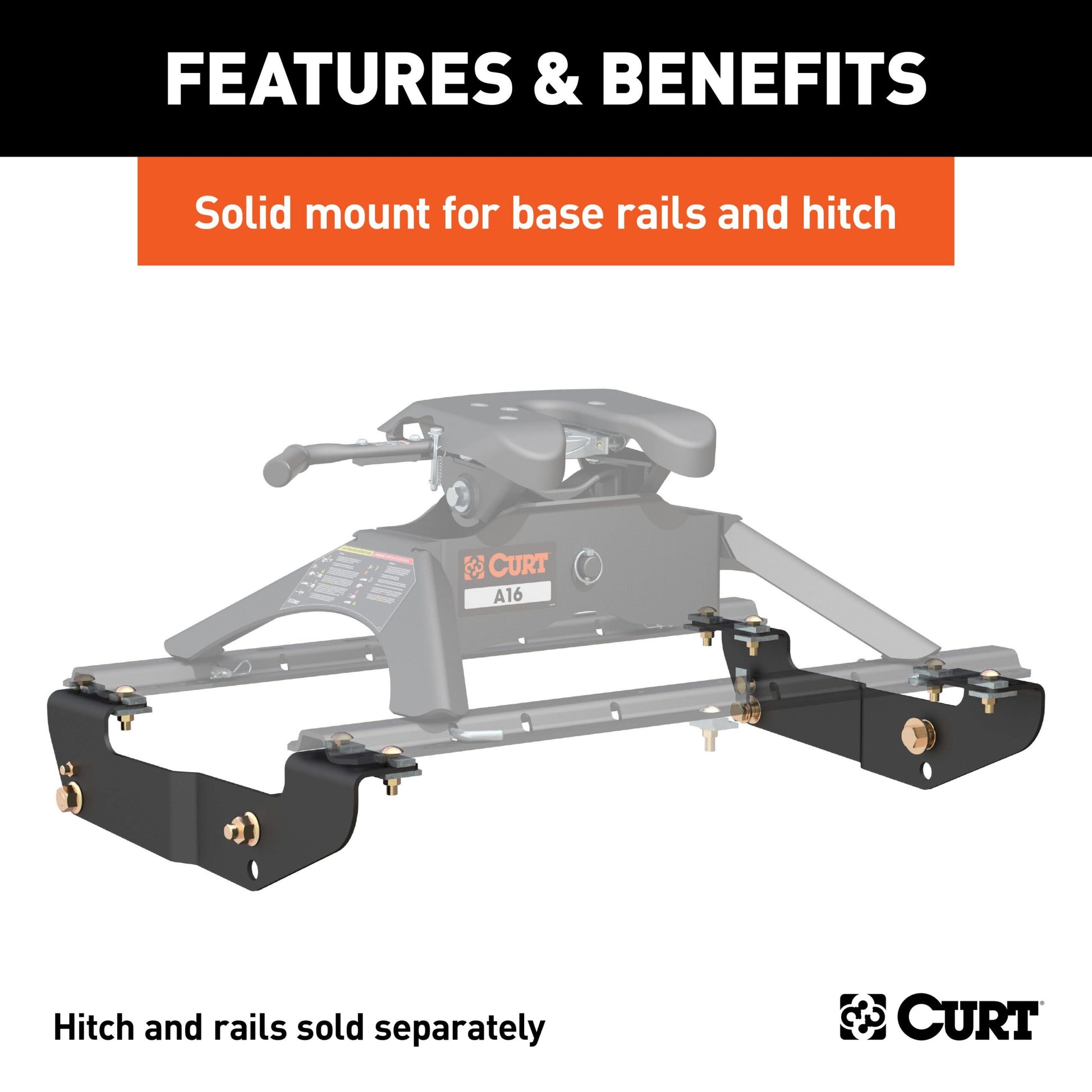 When you purchase a 5th wheel trailer hitch, you expect it to be capable of towing your RV, flatbed or whatever other 5th wheel trailer you own. While a 5th wheel hitch does offer an impressive amount of towing strength, it cannot get far without the proper installation equipment. Engineered for specific makes and models, CURT custom 5th wheel brackets provide the ideal solution for complementing the power of your 5th wheel trailer hitch. A custom 5th wheel bracket features a shape that contours to the frame of your truck and uses pre-drilled holes in the frame wherever possible to make installation quick and easy. Depending on your model of pickup truck, they also reduce or eliminate the need for drilling. These particular custom 5th wheel brackets offer a custom fit for certain model years of the Chevrolet Silverado 1500, 2500 HD and 3500 HD and GMC Sierra 1500, 2500 HD and 3500 HD (see application info to verify fitment). Finished in a durable liquid A-coat, CURT custom 5th wheel brackets are made to last. They include all necessary mounting hardware and are designed to be used in conjunction with CURT industry-standard 5th wheel base rails #16104 or #16204 (base rails sold separately).