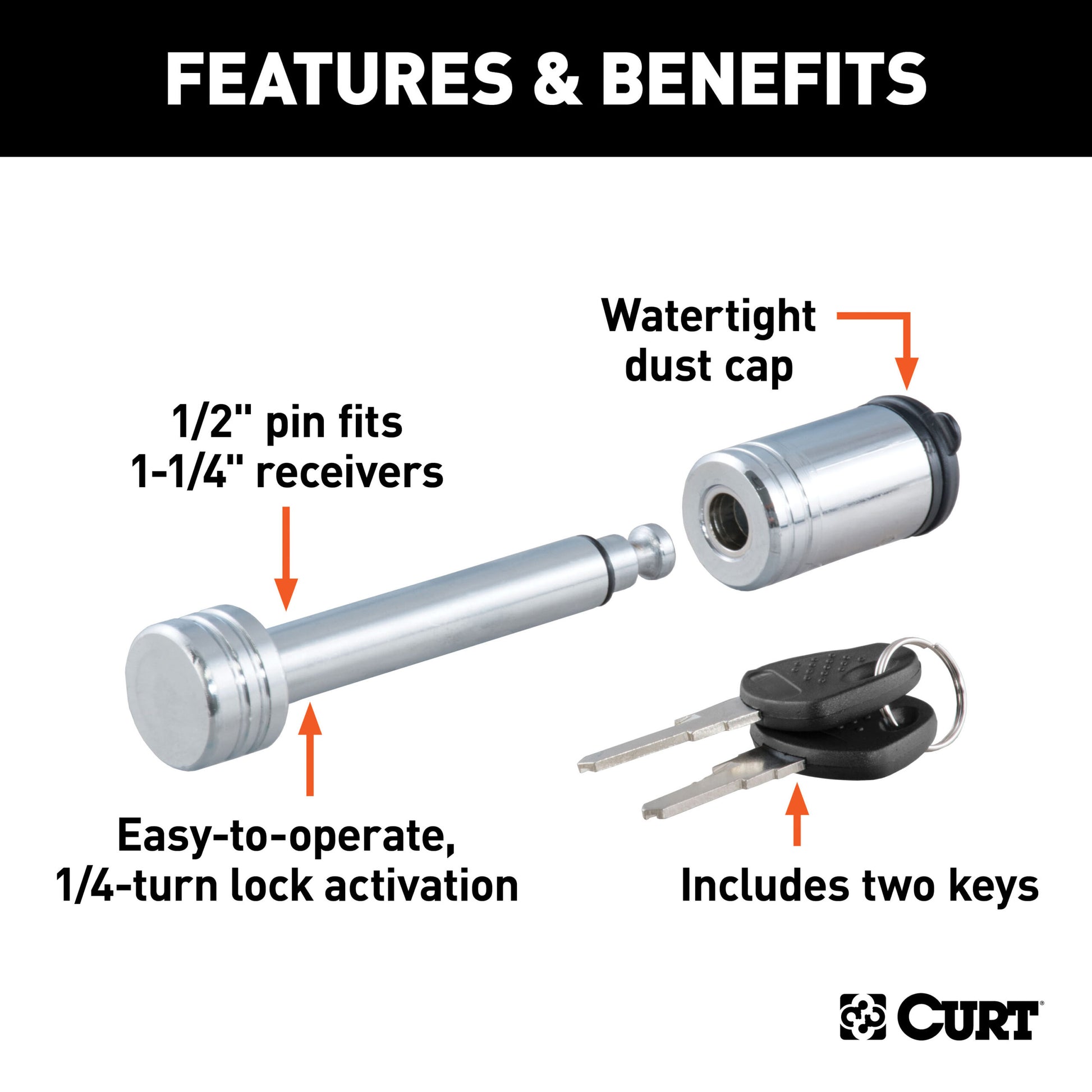 Make your tow vehicle and trailer more secure by keeping them locked up tight with a CURT hitch lock. Like a hitch pin and clip, a hitch lock is designed to insert into the fastener hole in the side of a receiver tube in order to hold a ball mount or hitch-mounted accessory in place. While a CURT hitch pin does offer sufficient strength for keeping your ball mount firmly attached, a CURT hitch lock goes one step further. CURT hitch locks allow you to lock your ball mount into your trailer hitch, deterring theft and preventing anyone from detaching your trailer at the ball mount and towing away your property without your permission. This CURT hitch lock features a barbell design and comes with a 1/2" pin diameter to fit a 1-1/4" receiver tube size. CURT barbell hitch locks are comprised of a pin with two end caps and a round locking mechanism. They are key-operated and activate with a simple 1/4-turn. They also come with a watertight dust cap to keep out the elements and prevent corrosion. For the ultimate in towing security, a hitch lock and coupler lock used together will provide security at both the vehicle-side and trailer-side of your towing setup. For your boat, ATV or camper, keep your toys more secure with CURT hitch locks.