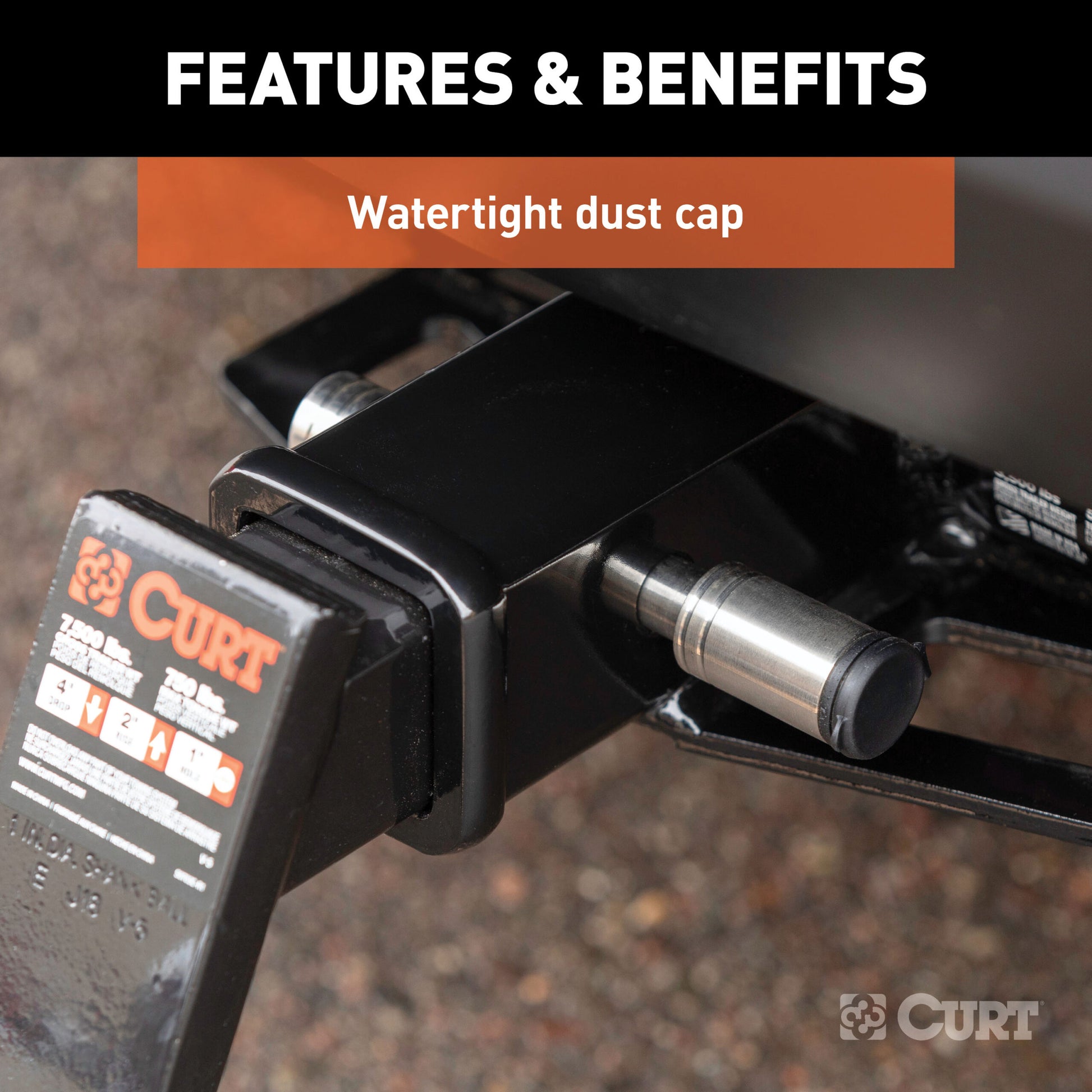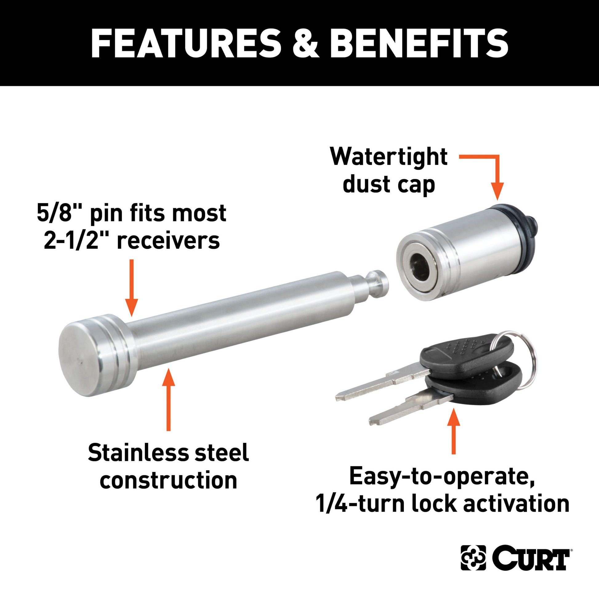 Make your tow vehicle and trailer more secure by keeping them locked up tight with a CURT hitch lock. Like a hitch pin and clip, a hitch lock is designed to insert into the fastener hole in the side of a receiver tube in order to hold a ball mount or hitch-mounted accessory in place. While a CURT hitch pin does offer sufficient strength for keeping your ball mount firmly attached, a CURT hitch lock goes one step further. CURT hitch locks allow you to lock your ball mount into your trailer hitch, deterring theft and preventing anyone from detaching your trailer at the ball mount and towing away your property without your permission. This CURT hitch lock features a barbell design and comes with a 5/8" pin diameter to fit a 2" or 2-1/2" receiver tube size. CURT barbell hitch locks are comprised of a pin with two end caps and a round locking mechanism. They are key-operated and activate with a simple 1/4-turn. They also come with watertight dust caps to keep out the elements and prevent corrosion. For the ultimate in towing security, a hitch lock and coupler lock used together will provide security at both the vehicle-side and trailer-side of your towing setup. For your boat, ATV or camper, keep your toys more secure with CURT hitch locks.