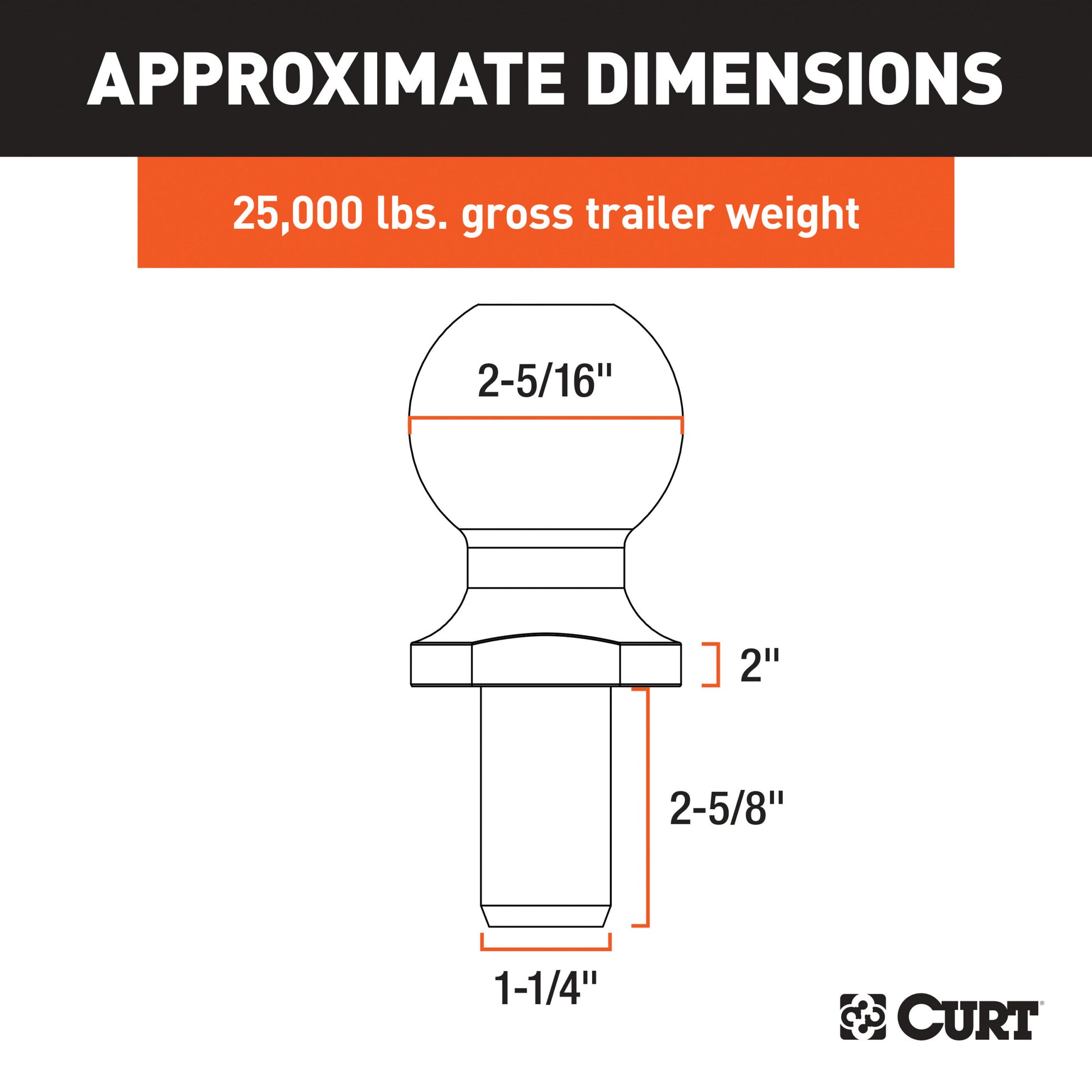 The CURT 2-5/16" trailer ball does not mess around. Simply put, it is a solid piece of towing equipment that makes all others look like they're just spinning their wheels. CURT 2-5/16" trailer balls are made with expert engineering to be packed with strength and durable enough to withstand the harsh wear of heavy-duty towing. Anything your class 5 trailer hitch and class 5 ball mount can handle, CURT has a 2-5/16" trailer ball to match. These tow balls are perfect for towing all types of heavy receiver-style trailers, including dump trailers, toy haulers, farm trailers, chopper boxes, dual-axle utility trailers, deluxe RVs, small yachts and more (NOTE: Never exceed the lowest weight capacity of any towing component; i.e. the vehicle, hitch, trailer, etc).This 2-5/16" trailer ball features a ball capacity of 25,000 lbs. It features a 1-1/4" shank diameter, a 2-5/8" shank length, 2" of rise and a raw steel finish to protect against the elements. To give you the power you need to tow with confidence, CURT 2-5/16" trailer hitch balls are thoroughly tested for safety and meet U.S. VESC specifications.
