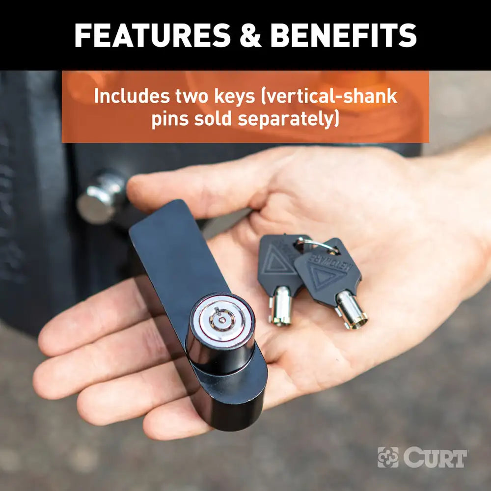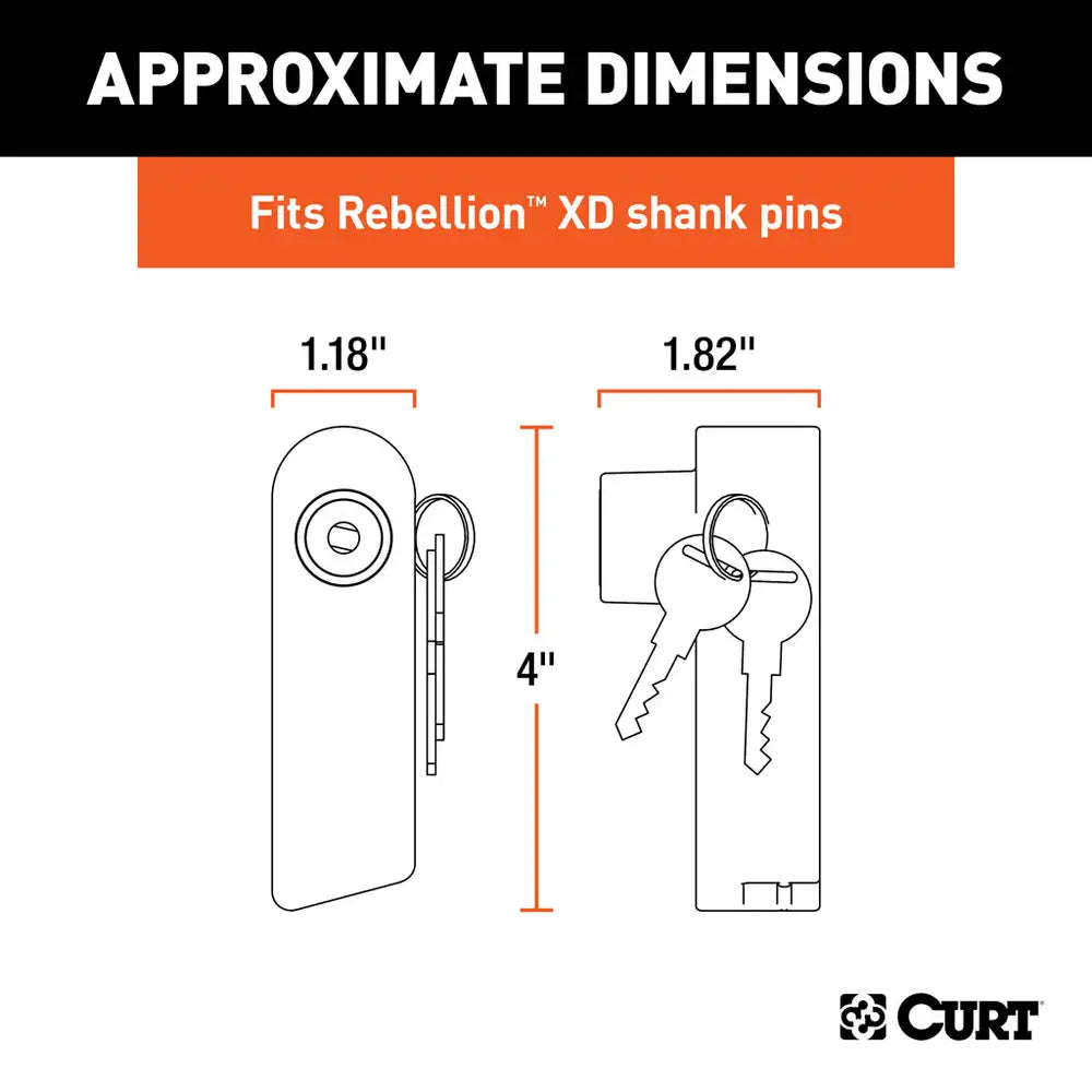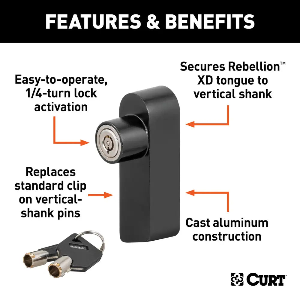 This tongue lock for the Rebellion™ XD ball mount provides enhanced security for your towing setup. It is constructed from cast aluminum and fits over the vertical-shank accessory pins of the Rebellion™ XD to lock the attachment in place. The lock features a 1/4-turn activation for convenience, and it includes two keys.