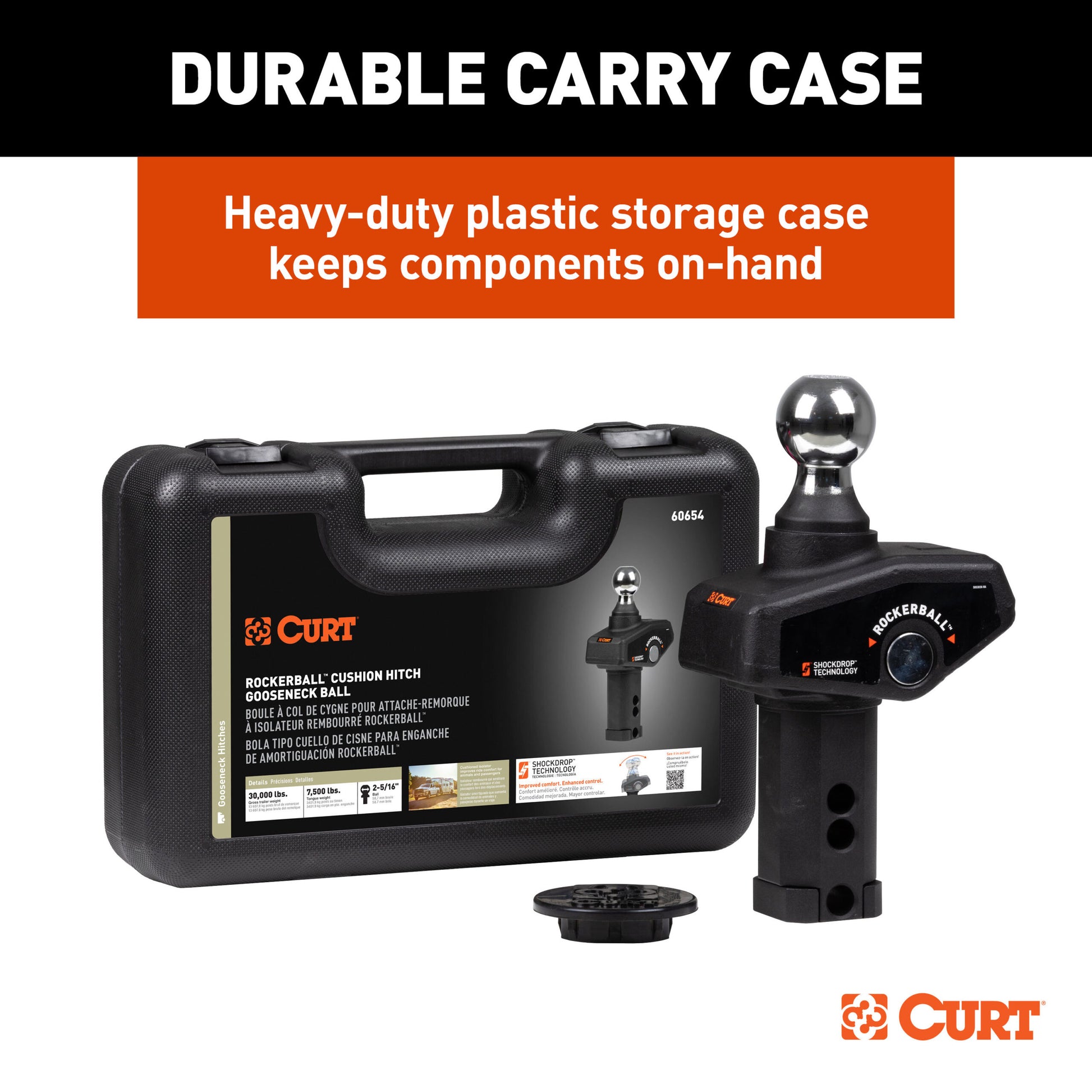 If your gooseneck hitch could use an upgraded ball that improves your ride and minimizes stress on your vehicle, the RockerBall is exactly what you need! The CURT RockerBall cushion hitch gooseneck ball features a cutting-edge structure combined with unique ShockDrop technology to provide a smoother, more comfortable towing experience without having to purchase or replace the entire hitch. RockerBall delivers an effortless upgrade to smoother gooseneck towing. With its simple, drop-in installation technique that eliminates the need to replace the trailer coupler, enhanced towing is just a few steps away by simply dropping the RockerBall into virtually any gooseneck receiver hitch ball hole with no additional adapters needed. Its state-of-the-art construction without airbags or bearings makes it virtually maintenance-free, providing an exceptional gooseneck towing experience that is a step above the rest. The RockerBall gooseneck ball is compatible with CURT Double Lock, Double Lock EZr and B&W; Turnoverball hitches, and has a standard 2-5/16" diameter ball that couples to most gooseneck trailers. With its integrated ShockDrop technology, RockerBall reduces jerking and jarring, essentially decreasing strain on the vehicle to promote longevity. Its cushioned isolator also improves ride quality by reducing rattling and vibration, providing passengers, animals, and cargo with added comfort to enjoy any journey. Its offset pin buffers vertical chucking and fore-to-aft motion during starts and stops, providing a cushion that leads to an all-around smoother ride. The RockerBall gooseneck ball is rated for up to 30,000 lbs. GTW and 7,500 lbs. vertical load limit, and is constructed with forged steel for dependable towing strength you can rely on. It comes complete with a durable carbide black powder coat finish on the base and chrome plating on the ball, and is tested for safety to meet SAE J2638 specifications to give you confidence for the road ahead in every aspect.