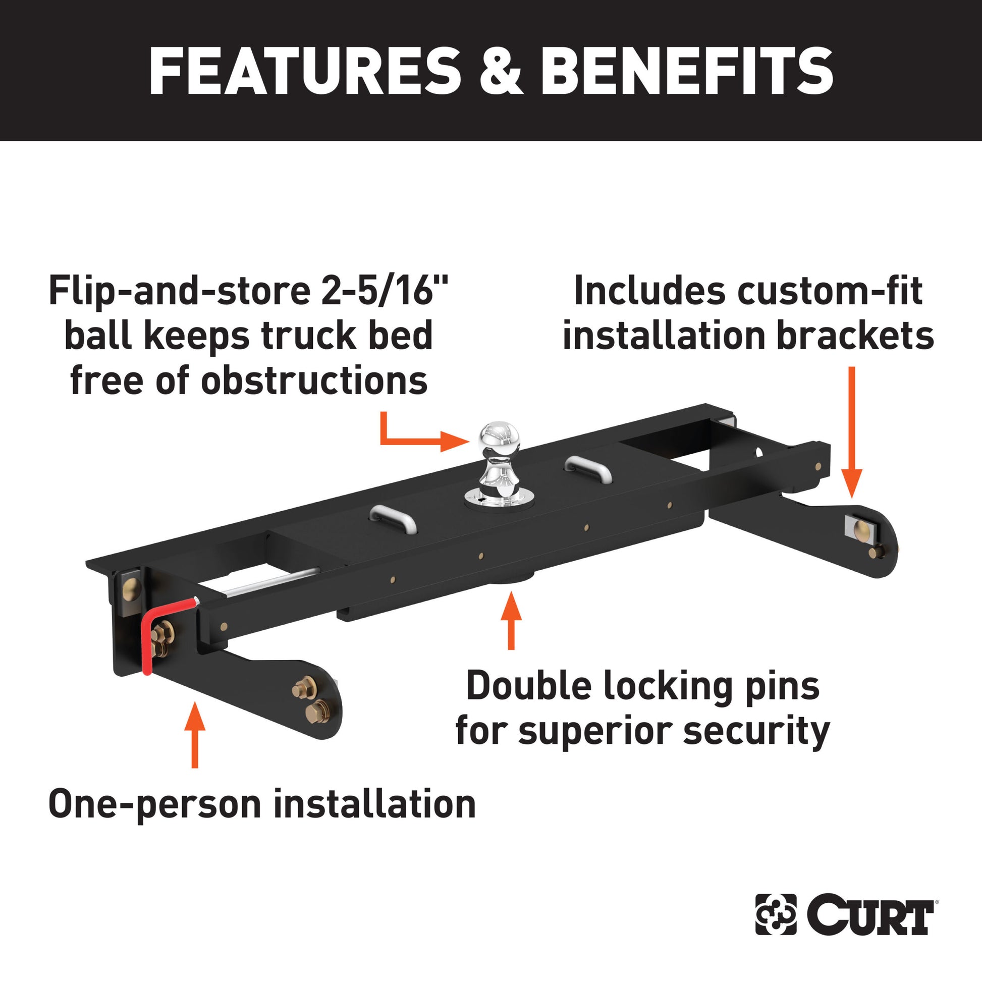They've made the truck said to turn the world under its tires and the trailer that moves mountains in a day. But what about the hitch powerful enough to connect the two? The CURT Double Lock EZr gooseneck hitch boasts easier installation, easier operation and 30,000 lbs. of towing capacity to make towing that oversize gooseneck trailer look easy. To make things even easier, this gooseneck hitch kit includes both the under-bed gooseneck hitch and the vehicle-specific installation brackets. The combined kit makes it simple to get your truck ready for towing by eliminating the need to purchase two different parts. It includes the #60611 gooseneck hitch and the #60624 installation brackets to fit certain years of the Chevy Silverado or GMC Sierra 2500 HD and 3500 HD (for a complete listing of compatibility, see the CURT application guide). Installation of the Double Lock EZr requires only one person, using retainer clips to keep bolts secure and the center section fully supported while mounting it into place. It also uses our patented center locator to eliminate meticulous measuring and ensure error-free drilling. The EZr also uses carriage bolts whenever possible for one-wrench tightening. Operation of the Double Lock EZr is simple and safe. It uses two locking pins and a 3/8" diameter handle to keep the gooseneck ball locked into the center section. The ball features a flip-over design that allows you to store it inside the receiver hole when not in use, keeping your truck bed completely free of obstructions. With a fortified center section, this hitch offers a gross trailer weight capacity up to 30,000 lbs. and a vertical load limit of 7,500 lbs., giving you the power you need to get the job done right. This CURT Double Lock EZr gooseneck hitch kit features a durable A-coat finish and includes a limited lifetime warranty. For safe, reliable towing you can count on, it is tested in accordance with SAE J2638 for safety.