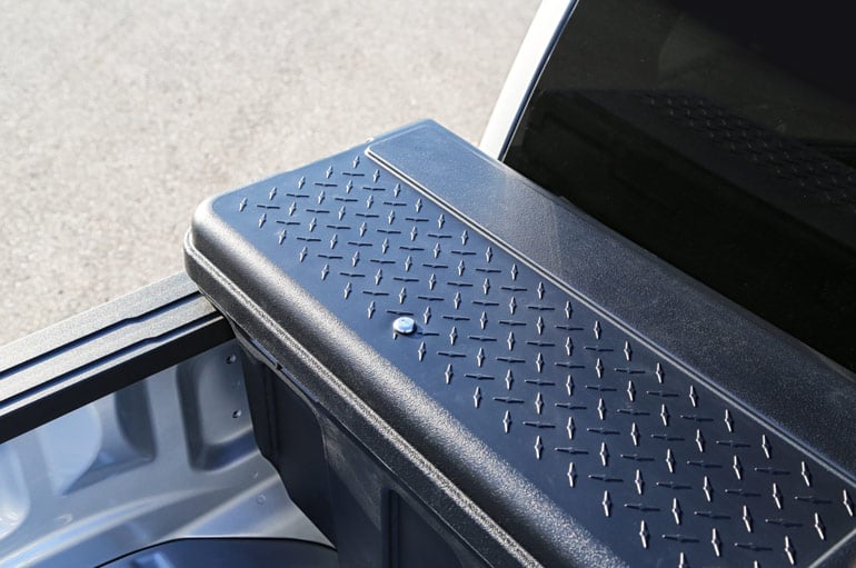 Don’t think you are sacrificing security with a lightweight ridgid frame. Metal striker plates are integrated into the lid to engage a full-length locking rod. This single moving part sucks down the entire rigid lid for secure closure every time. The rotary keyed lock stops the bar from moving when locked. Both the keyhole and sliding rod operate from the driver’s side.