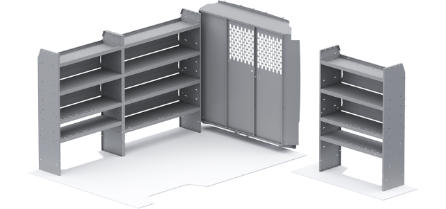 The ideal starter package, with a bulk head partition and three shelving units to get you quickly on the road. And your upfitter can easily add Holman brand accessories and options as your business grows.