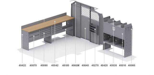 Kargo Master Van Interior Packages take the guess work out of where to begin upfitting your cargo van. With our strong easily adjustable shelving, partitions and accessories, our van packages have everything you need to put your van to work. Our professional designers and product engineers have created customized van packages for specific service categories to help you easily outfit a van based on input from experienced industry tradesmen.