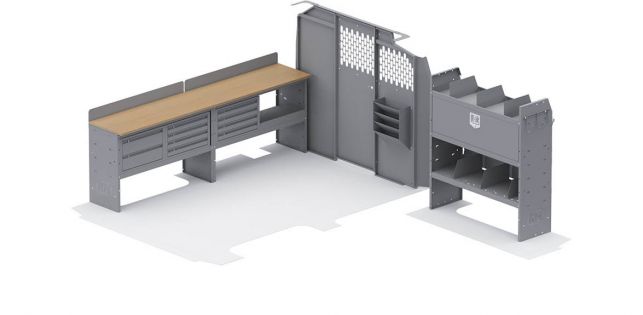 The Locksmith van shelving package from Kargo Master offers professionals convenient storage mixed with a spacious workbench.