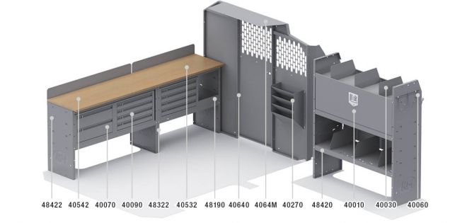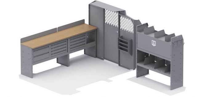 The Locksmith van shelving package from Kargo Master offers professionals convenient storage mixed with a spacious workbench.
