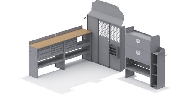The Locksmith van shelving package from Kargo Master offers professionals convenient storage mixed with a spacious workbench.