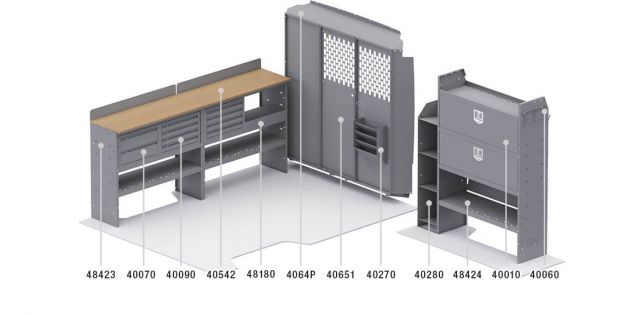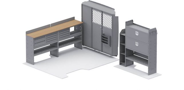The Locksmith van shelving package from Kargo Master offers professionals convenient storage mixed with a spacious workbench.