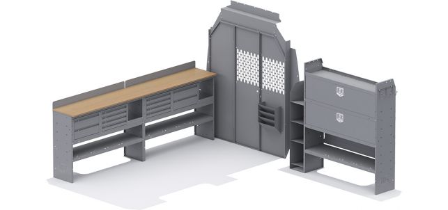 The Locksmith van shelving package from Kargo Master offers professionals convenient storage mixed with a spacious workbench.