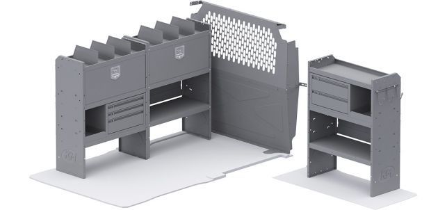 Kargo Master Van Interior Packages take the guess work out of where to begin uplifting your cargo van. With our strong easily adjustable shelving, partitions and accessories, our van packages have everything you need to put your van to work. Our professional designers and product engineers have created customized van packages for specific service categories to help you easily outfit a van based on input from experienced industry tradesmen.