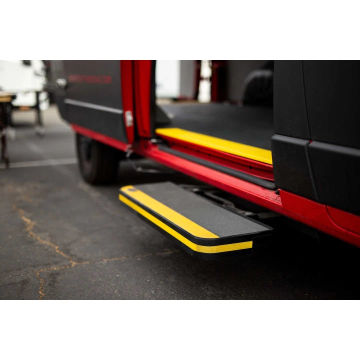This revolutionary side door step mechanically deploys as the door is open and closed. No electrical wiring – it’s automatic, but not electric. Superior legendary quality outlasts and outperforms fixed and electric steps alike. The discreet yet highly functional design ensures a streamlined appearance while providing a practical solution for our Legends of the Road. With a focus on both form and function, this retractable side door step exemplifies the marriage of advanced engineering and user-friendly design in modern automotive technology.
