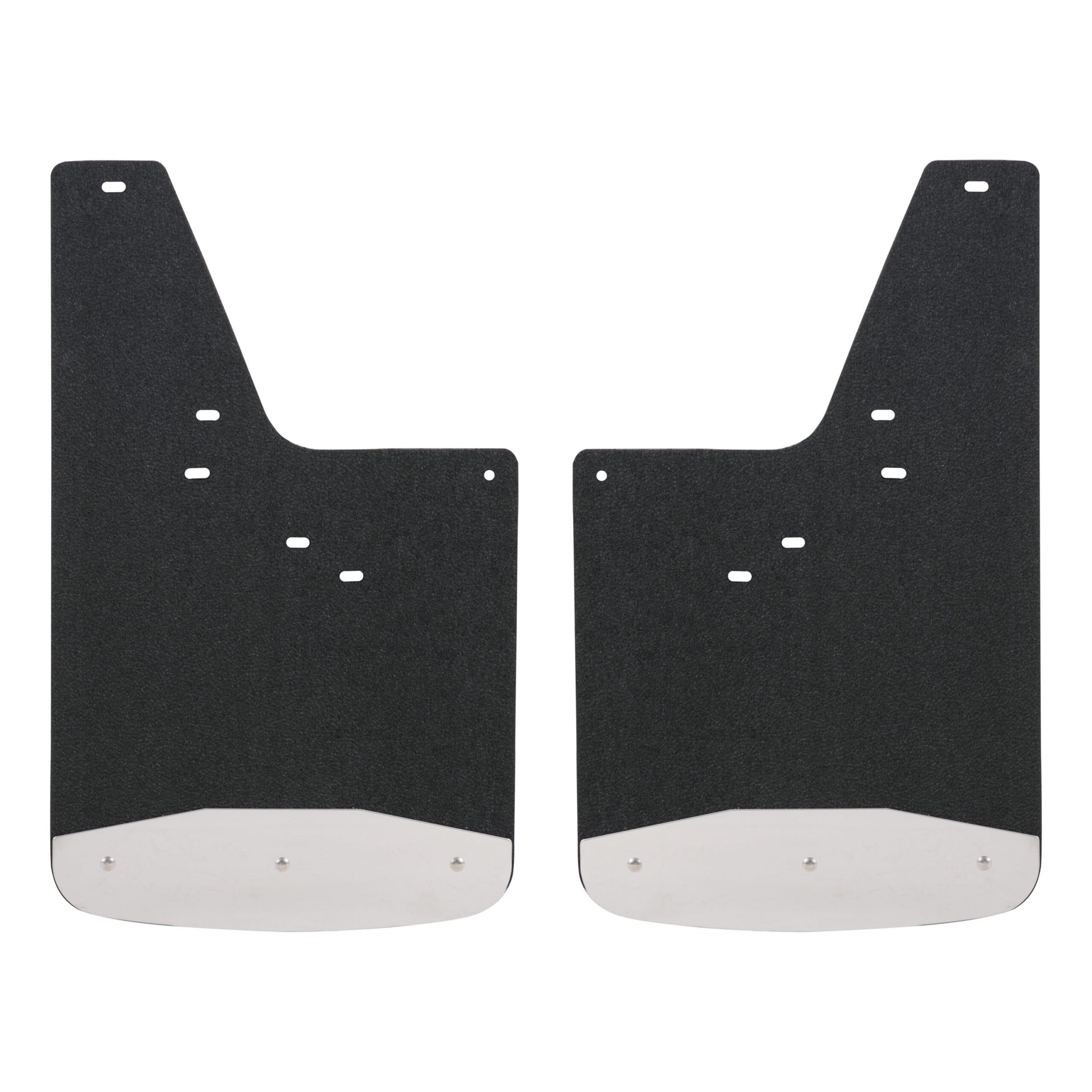 Whether you're on the job or off-roading through the wilderness, it doesn't take long for rocks and other debris to wreak havoc on the body of your truck. LUVERNE Textured Rubber Mud Guards are the perfect solution for maintaining that pristine, professional look. For the front or rear of the truck, these custom mud flaps add style and body protection. They are constructed from heavy-duty black rubber that stands up to road debris and sheds water with ease. They feature 18-gauge stainless steel plates to help protect the bottom edge and extend the life of the mud flaps. With their 3/8" thick, recycled rubber construction, Textured Rubber Mud Guards easily deflect everything from mud to gravel, protecting the body of your truck from scratches, chips and scuffs. They are also made to add a stylish accent to your truck, featuring stainless steel plates along the bottom edge of each flap. The plates are made from 18-gauge stainless steel to provide a heavy-duty, rust-resistant shield, and they feature a bright, high-polish finish for a long-lasting shine. The textured finish of the rubber mud flaps is also designed to easily hide minor scuffs and scratches and maintain a clean appearance. For an easy installation and a custom fit, these truck mud flaps are made vehicle-specific. This particular set fits specific years of the Chevy Silverado 1500, 2500 HD or 3500 HD and GMC Sierra 1500, 2500 HD or 3500 HD (see application info to verify fitment). They install with corrosion-resistant fasteners and high-strength steel mounting brackets with a galvanized finish for long-lasting durability. Universal mud flaps are also available.
