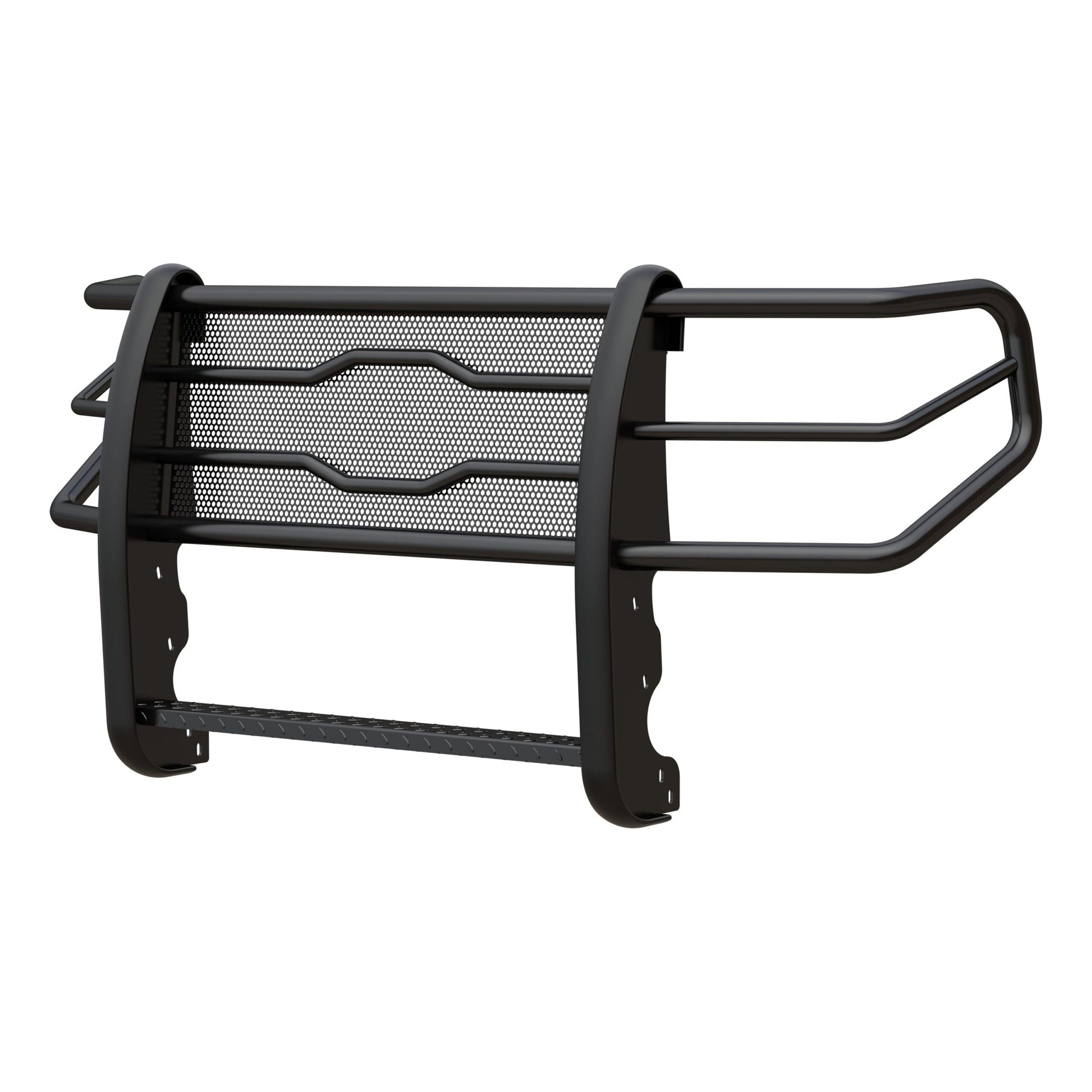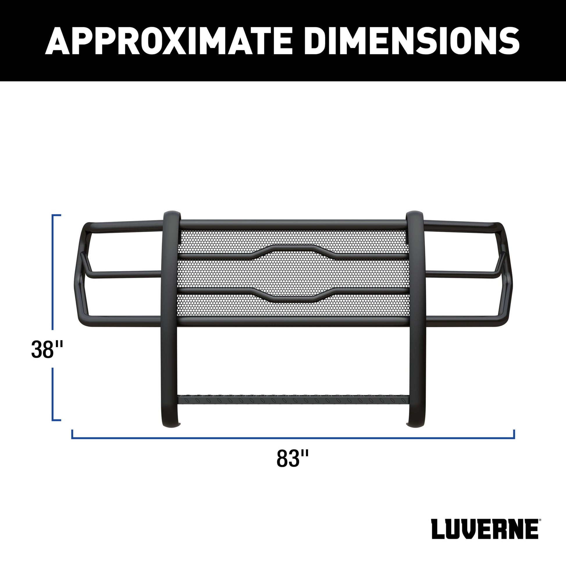 Basic. Standard. Stock. Some words were never intended to describe your truck, and it takes a certain type of hardworking truck accessory to meet your expectations. The LUVERNE Prowler Max grille guard equips your truck to tackle the toughest jobs with its uncommon construction, comprehensive protection and arsenal of extra features. It begins with a bold, punched steel screen center section. This heavy-gauge mesh not only adds style to the Prowler Max but also increases protection for your grille, shielding it from rocks, debris and other threats. The center section features our signature logo reveal with contoured horizontal tubes to add even more protection and increase structural stability. Below the center section is a built-in 4" wide step with non-skid, diamond treads. The step blends perfectly with the grille guard and provides easier access when working under the hood, particularly on large, full-size pickup trucks. The Prowler Max aftermarket grille guard also distinguishes itself with its vehicle-specific wraparound ring assembly. The double-stacked side brush guards uniquely contour to the front end of each truck application for increased headlight protection. This particular custom truck grille guard fits specific years of the Ford F250, F350, F450 and F550 Super Duty (see application info to verify fitment). To give it the muscle to stand behind its attitude, we construct the Prowler Max from one-piece, 2" diameter tubular steel. Its heavy-duty uprights bolt directly to the frame of the truck, using high-strength steel brackets and a no-drill installation. To finish things off, the Prowler Max truck grille guard is available in two finish options. The E-coat and black powder coat finish offers maximum durability, while the high-polish stainless steel provides a bright, no-rust shine.