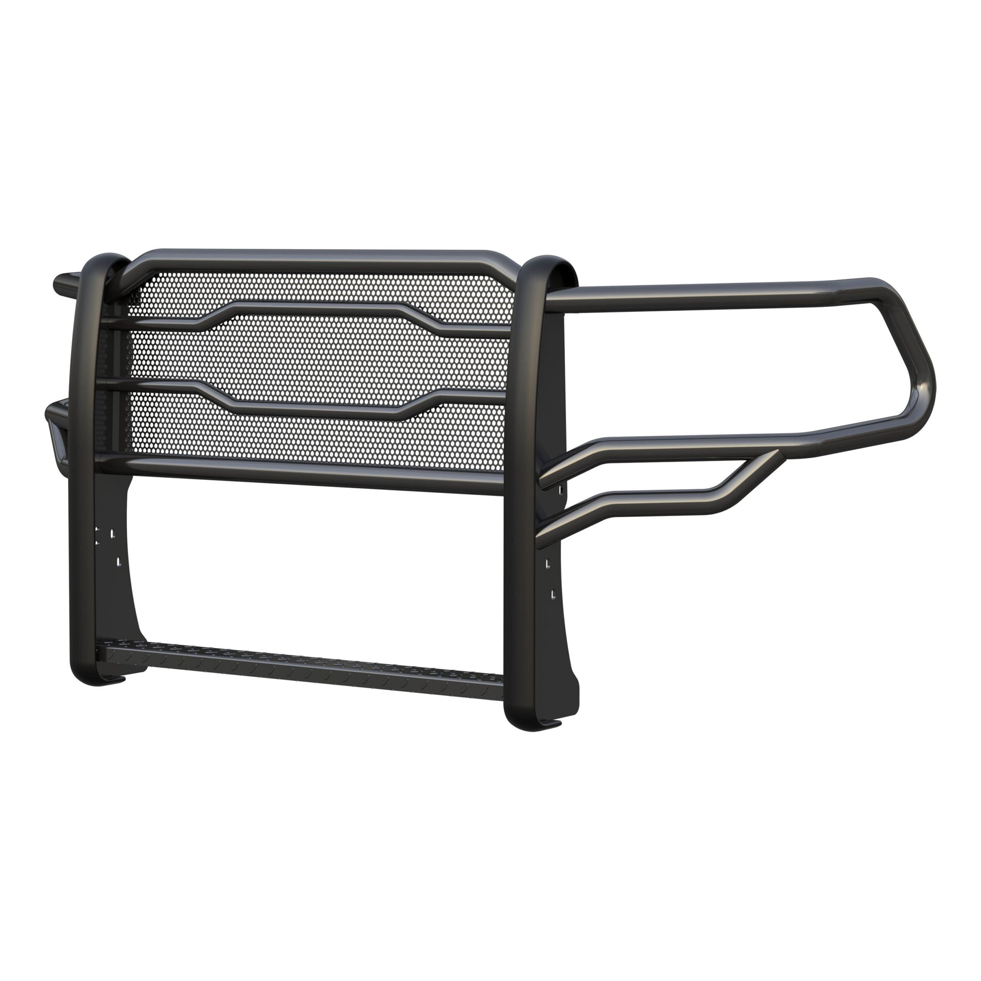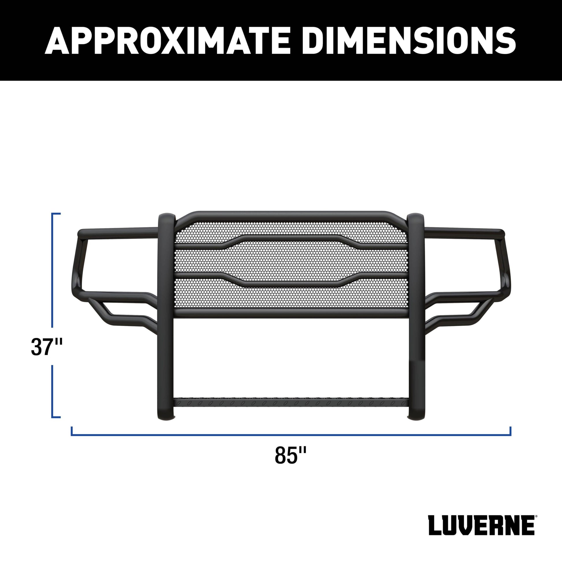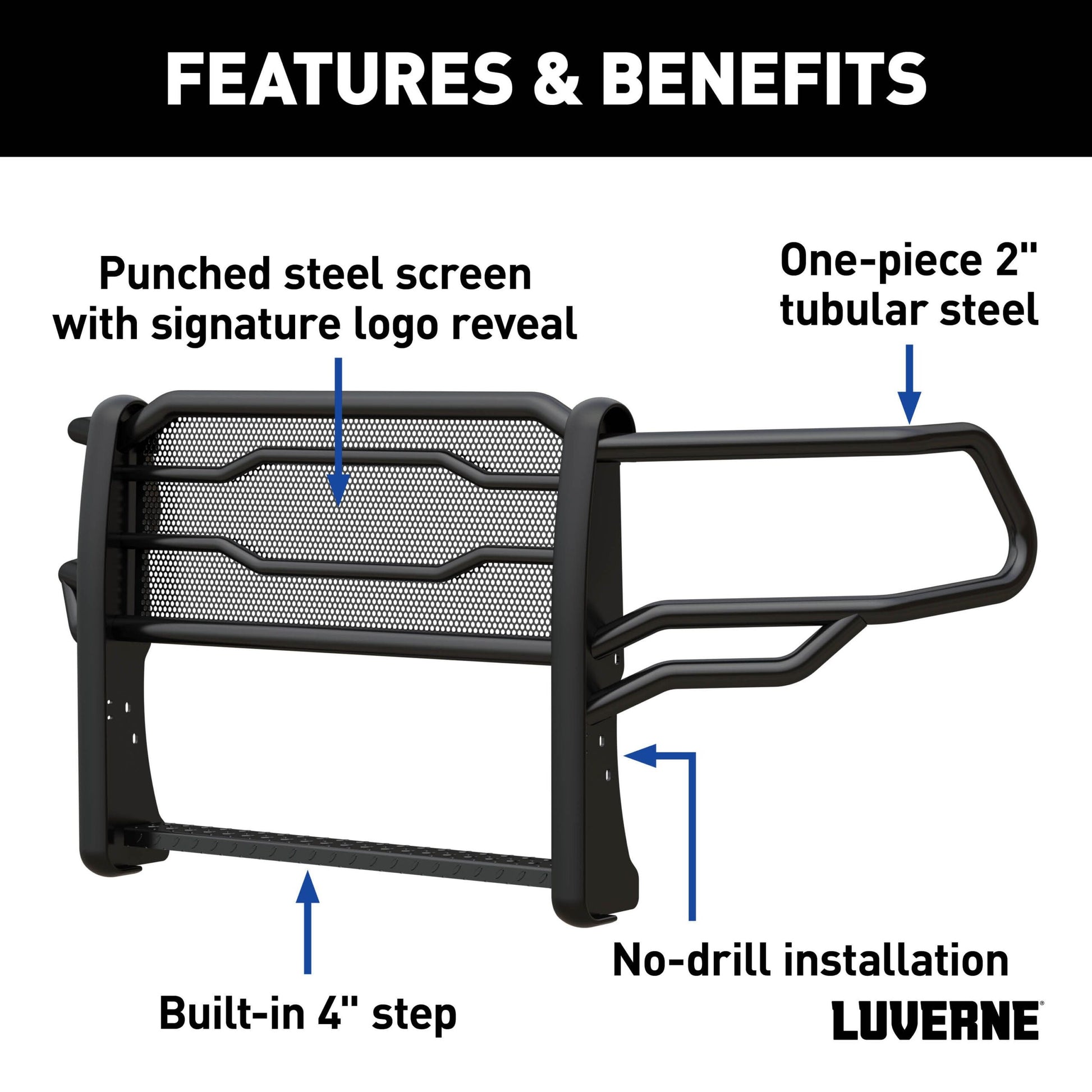 Basic. Standard. Stock. Some words were never intended to describe your truck, and it takes a certain type of hardworking truck accessory to meet your expectations. The LUVERNE Prowler Max grille guard equips your truck to tackle the toughest jobs with its uncommon construction, comprehensive protection and arsenal of extra features. It begins with a bold, punched steel screen center section. This heavy-gauge mesh not only adds style to the Prowler Max but also increases protection for your grille, shielding it from rocks, debris and other threats. The center section features our signature logo reveal with contoured horizontal tubes to add even more protection and increase structural stability. Below the center section is a built-in 4" wide step with non-skid, diamond treads. The step blends perfectly with the grille guard and provides easier access when working under the hood, particularly on large, full-size pickup trucks. The Prowler Max aftermarket grille guard also distinguishes itself with its vehicle-specific wraparound ring assembly. The double-stacked side brush guards uniquely contour to the front end of each truck application for increased headlight protection. This particular custom truck grille guard fits specific years of the Ram 2500, 3500, 4500 and 5500 (see application info to verify fitment). To give it the muscle to stand behind its attitude, we construct the Prowler Max from one-piece, 2" diameter tubular steel. Its heavy-duty uprights bolt directly to the frame of the truck, using high-strength steel brackets and a no-drill installation. To finish things off, the Prowler Max truck grille guard is available in two finish options. The E-coat and black powder coat finish offers maximum durability, while the high-polish stainless steel provides a bright, no-rust shine.
