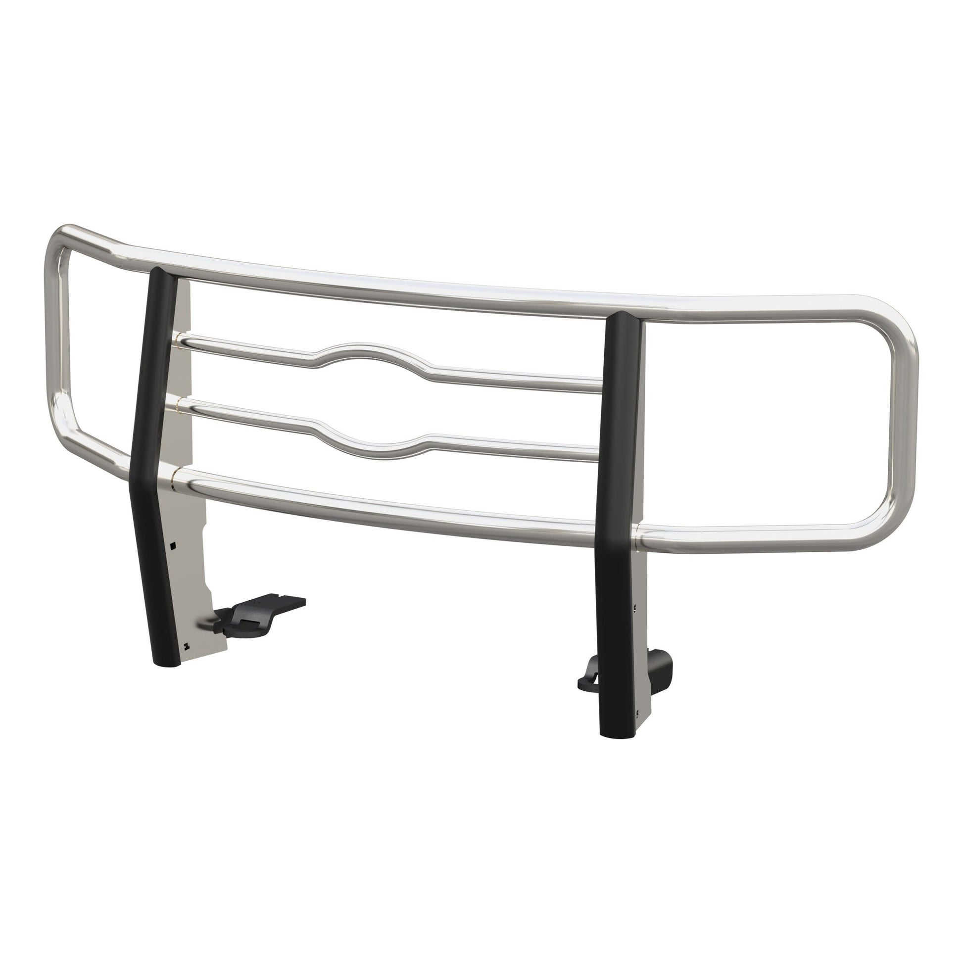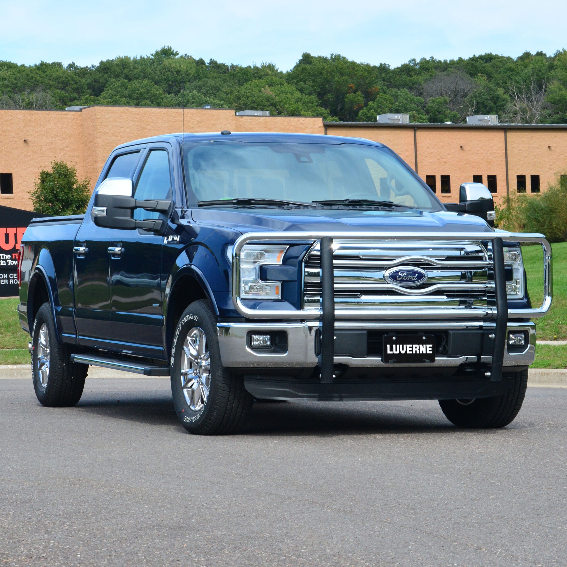 Adding accessories to your truck is all about highlighting and showing off its existing features, and no front-end accessory shows off these features quite like a LUVERNE grille guard. Our 2" tubular grille guard features our signature logo reveal and a vehicle-specific fit -- all to maximize front-end protection and truly make it all about your truck. It starts with our classic center section. The horizontal tubes are contoured to create our signature logo reveal, showing off your vehicle's badge with pride. The tubes also add extra protection for your vehicle's grille. To add some beef to the front end of your vehicle, the LUVERNE 2" brush guard is built tough. It is constructed from high-strength steel, assembled right here in the USA, to ensure the utmost quality. The frame-mounted uprights provide a solid structural base and are shielded with extruded rubber covers to better protect the finish. We also add a polished stainless steel backing to the uprights, giving them a clean, finished appearance that will outlast rust. Our 2" tubular grille guards are available in a durable textured black powder coat or a bright chrome-plated finish to suit the look of your own unique truck. To finish off the LUVERNE 2" steel brush guard and truly make it an accessory fit for your vehicle, we make each one vehicle-specific. This means no drilling necessary during the install and compatibility with your factory tow hooks on most models. This particular custom grille guard fits specific years of the Ford F150 (see application info to verify fitment). It mounts directly to the frame using strong steel brackets, and the brackets are covered in a black powder coat finish to ensure long-lasting durability. NOTE: Ring assembly and upright package included but shipped separately.