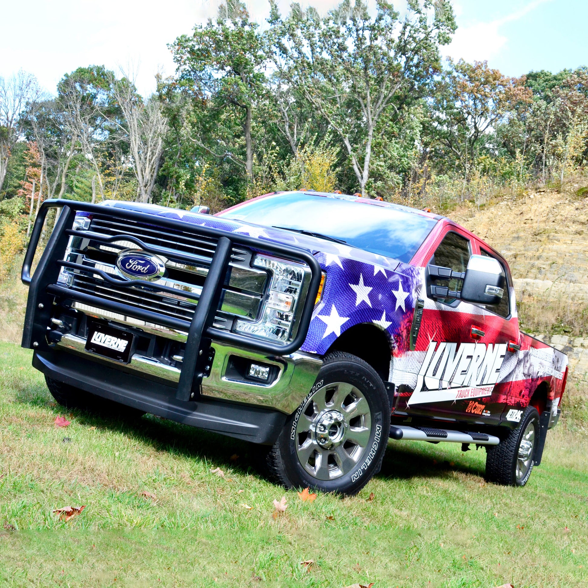Adding accessories to your truck is all about highlighting and showing off its existing features, and no front-end accessory shows off these features quite like a LUVERNE grille guard. Our 2" tubular grille guard features our signature logo reveal and a vehicle-specific fit -- all to maximize front-end protection and truly make it all about your truck. It starts with our classic center section. The horizontal tubes are contoured to create our signature logo reveal, showing off your vehicle's badge with pride. The tubes also add extra protection for your vehicle's grille. To add some beef to the front end of your vehicle, the LUVERNE 2" brush guard is built tough. It is constructed from high-strength steel, assembled right here in the USA, to ensure the utmost quality. The frame-mounted uprights provide a solid structural base and are shielded with extruded rubber covers to better protect the finish. Our 2" tubular grille guards are available in a durable textured black powder coat or a bright chrome-plated finish to suit the look of your own unique truck. To finish off the LUVERNE 2" steel brush guard and truly make it an accessory fit for your vehicle, we make each one vehicle-specific. This means no drilling necessary during the install and compatibility with your factory tow hooks on most models. This particular custom grille guard fits specific years of the Ford F250 Super Duty, F350 Super Duty, F450 Super Duty and F550 Super Duty (see application info to verify fitment). It mounts directly to the frame using strong steel brackets, and the brackets are covered in a black powder coat finish to ensure long-lasting durability. NOTE: Ring assembly and upright package included but shipped separately.