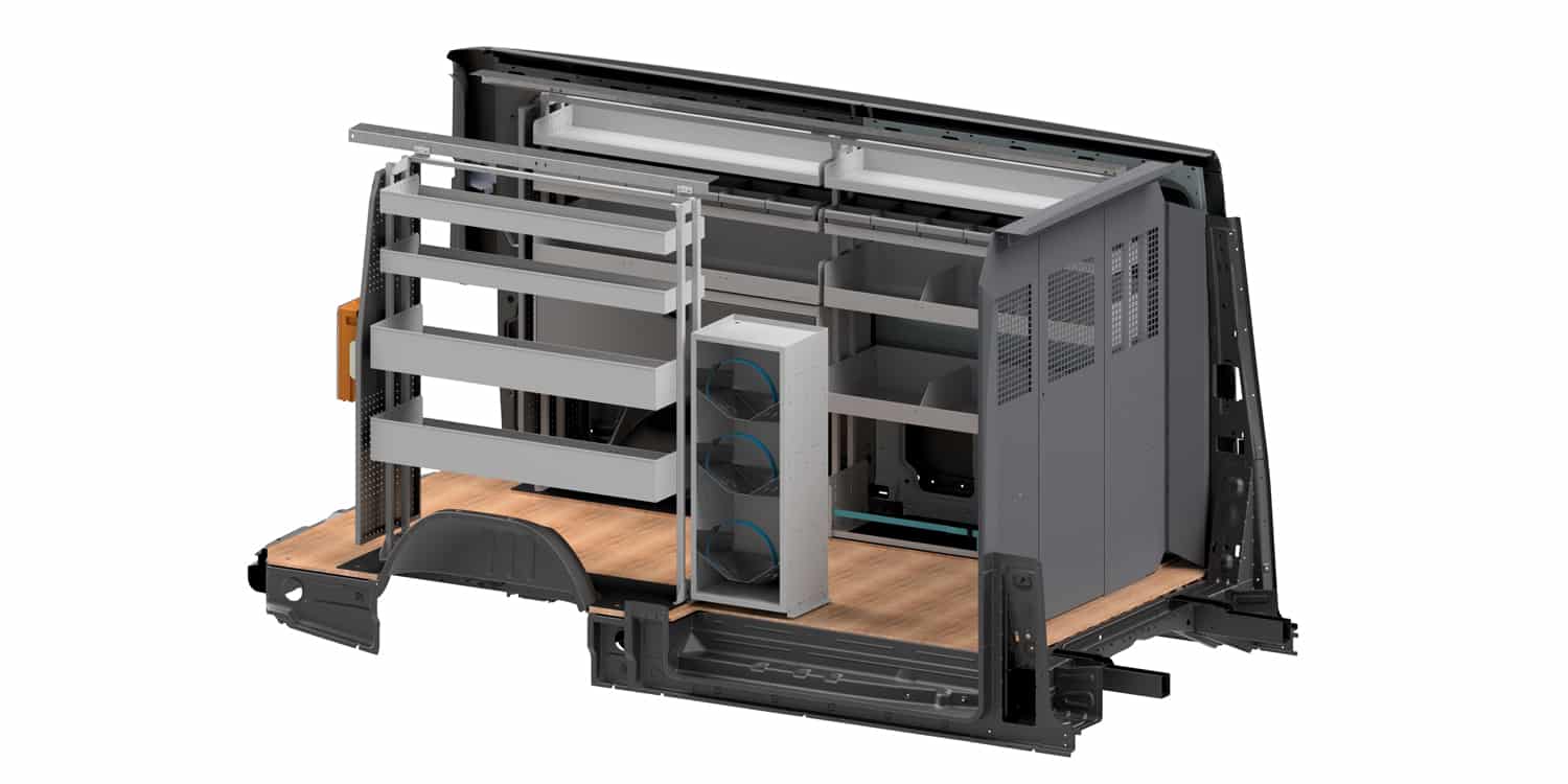 Van shelving for Mercedes Sprinter – HVAC Bin package with Standard Set back Partition & Anchor kit for the Mercedes Sprinter 144″ WB Standard Roof