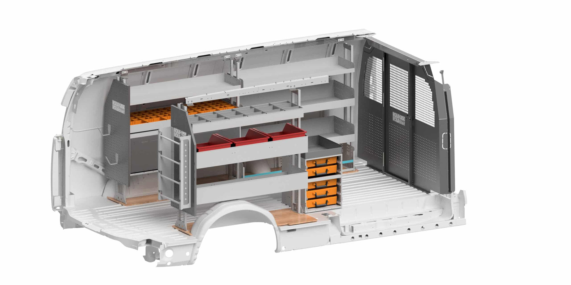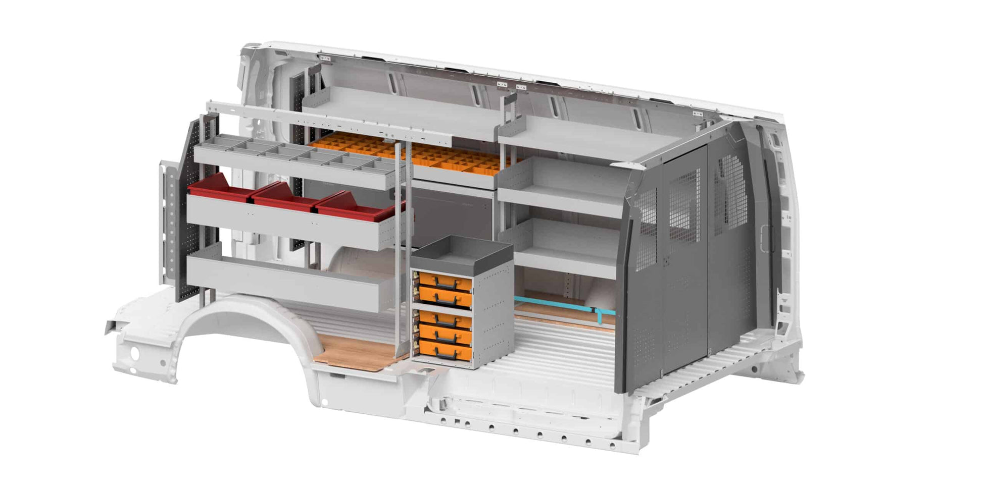 Van shelving Chevy Express 155″ wb Electrical Bin package with Standard Set back Partition & Anchor kit