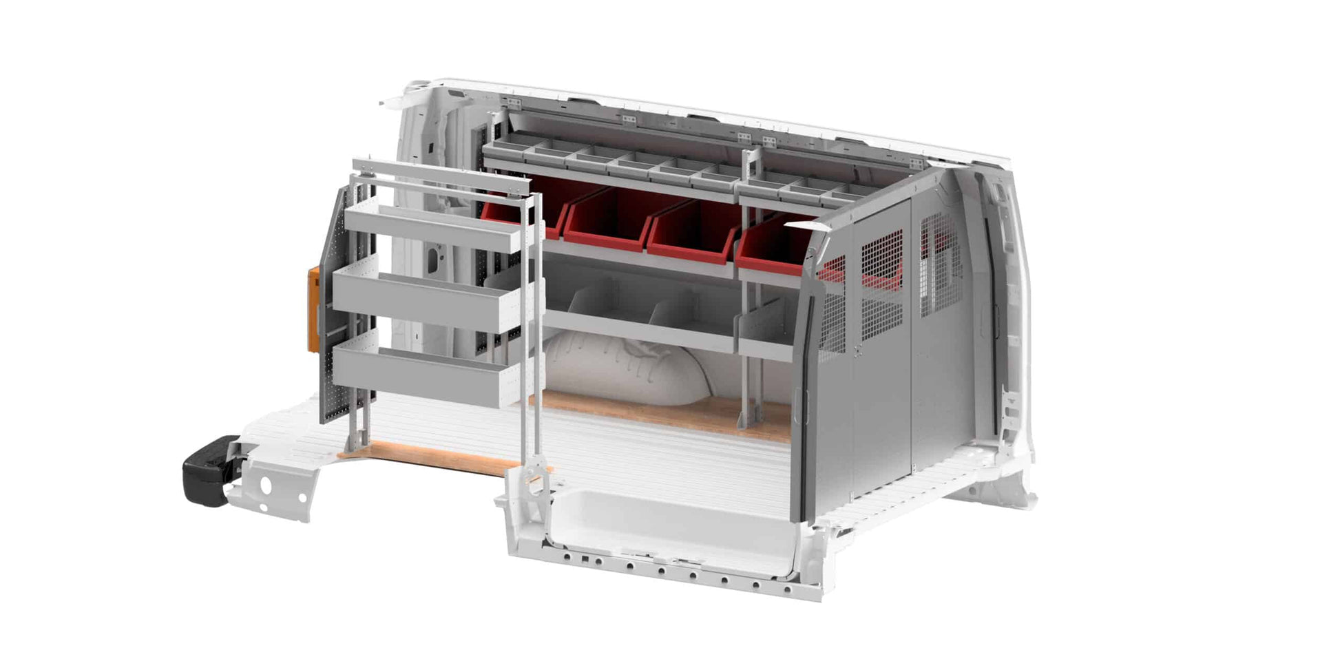 Van shelving for Chevy Express 135 Americas Most Popular Bin Package with Standard Set back Partition & Anchor kit