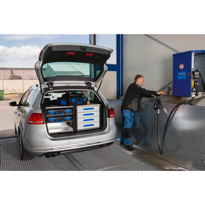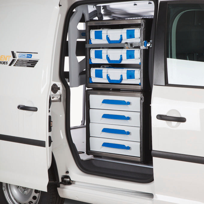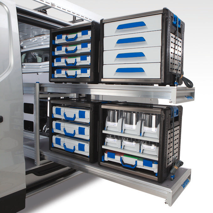 This module is equipped with four drawers, height 6 (internal dimensions WxHxD): 418 x 89 x 314 mm). The drawers store objects, keep them concealed from view and are easily accessible due to its full extension. They can be easily subdivided with accessories such as inset boxes, small component trays or dividers and provide a more clear arrangement and organization saving you time. Optional anti-rattle mats on the floor of the drawer prevents movement of the contents and absorbs noise.