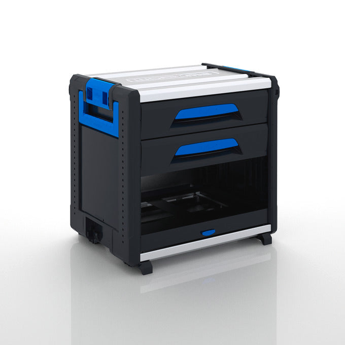 This WorkMo module is equipped with two drawers, height 6 (internal dimensions WxHxD): 418 x 89 x 314 mm) and a MultiSlide. The Multi slide provides space for cases and BOXXes (Metal case up to a max. 340, L-BOXXes up to a max. 136) and enables unlimited access to its contents thanks to its full extension. The drawers can be easily subdivided with accessories such as inset boxes, small component trays or dividers and provides a more clear arrangement and orderliness. Optional anti-rattle mats on the floor of the drawer prevents movement of the contents and absorbs noise.
