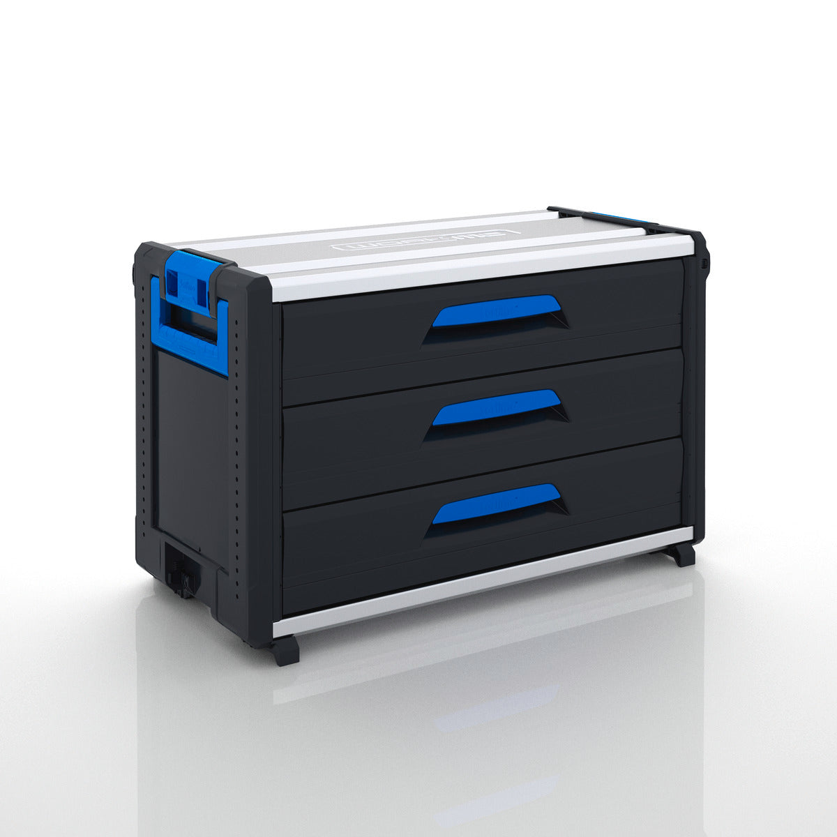 This module is equipped with three drawers, height 8 (internal dimensions WxHxD): 660 x 123 x 314 mm). The drawers store objects, keeps them concealed from view and are easily accessible due to its full extension. They can be flexibly subdivided with accessories such as inset boxes, small component trays or dividers and provides a clear arrangement and orderliness. Optional anti-rattle mats on the floor of the drawer prevents movement of the contents and absorbs noise.