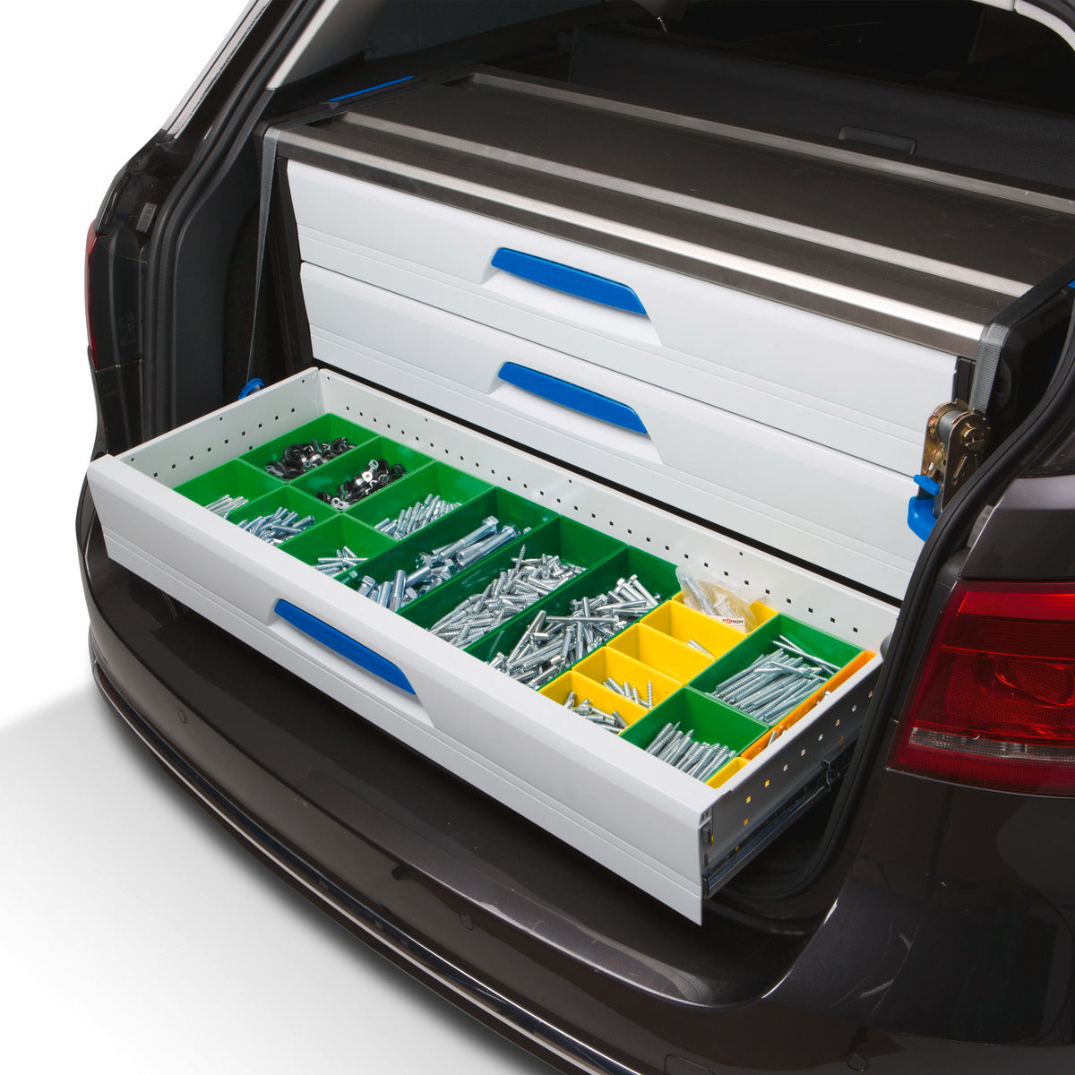 This module is equipped with three drawers, height 8 (internal dimensions WxHxD): 418 x 123 x 314 mm). The drawers store objects, keeps them concealed from view and are easily accessible due to its full extension. They can be subdivided with accessories such as inset boxes, small component trays or dividers and provides a more clear arrangement and orderliness. Optional anti-rattle mats on the floor of the drawer prevents movement of the contents and absorbs noise.