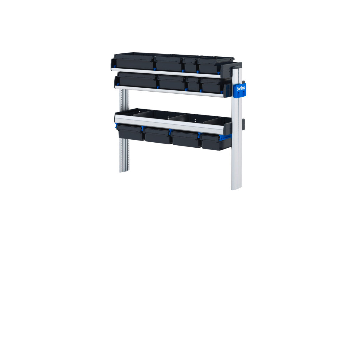 The loading space of the vehicle is ideally used with the SR5 concept. The compact side profiles require considerably less space than the frame construction of conventional van racking systems. In addition, ProClick is copatible with the side profiles so that tool bags or SR5 accessories can be hooked into the ProSafe perforations without using tools. Variation in the component depths and installation position means that the van racking system ideally adapts to the contour of the vehicle.