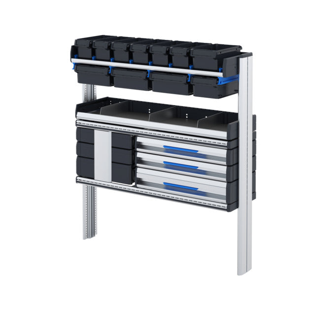 The loading space of the vehicle is ideally used with the SR5 concept. The compact side profiles require considerably less space than the frame construction of conventional van racking systems. In addition, ProClick is copatible with the side profiles so that tool bags or SR5 accessories can be hooked into the ProSafe perforations without using tools. Variation in the component depths and installation position means that the van racking system ideally adapts to the contour of the vehicle.
