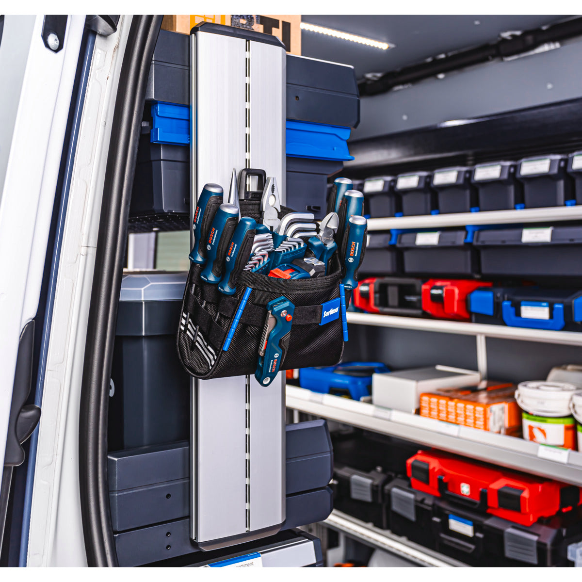 The ProClick system is a new product line for mobile working that incorporates itself seamlessly in the working day of every handyman and service technician. Developed by BS Systems, a joint venture between Sortimo and BOSCH, the , ProClick is a product line that allows you to carry tools and working materials directly on you using textile bags. It also teams up perfectly with the EcoSystem by Sortimo and BOSCH. In other words, it is compatible with a wide variety of existing Sortimo and BOSCH products - irrespective of the brand.Unlimited possibilities with one click: The patented system consists of two main elements: The ProClick Holder and the hook. When you bring the two items together there is a “click”, indicating that the hook has engaged and is fixed securely.The ProClick system is an ideal companion in virtually all situations in your daily working life, since the bags can be fixed both in the familiar Sortimo ProSafe holes as well as in the ProClick Holder, using the hooks. This means that the ProClick products can also be used as accessories in the van racking, and, looking at it the other way round, the van racking can be used as a practical storage system for the ProClick bags, which can be taken onto the site using the tool belt.In addition to the mounting options on the van racking, additional Sortimo products, such as the AutoAssistant and the C-BOXX also have mounts for the ProClick bags. They can therefore also be hung up here quickly, serving as extended storage.The ProClick bags are available in various different sizes and design. They are made from sturdy polyester (1000 den) and are fitted with practical dividers, loops and holders, so that tools and consumables all have their own fixed place and can be easily located.Particularly in combination with the tool belt, the ProClick bags offer a perfect overview of working materials, as opposed to trouser pockets, can be preloaded to suit the specific task at hand, and can be replaced quickly.The reflective strips on the sides improve visibility in the dark and offer additional protection - particularly in the dark winter months.(Pictures are similar, decorative material not included; shipping only within the U.S.)