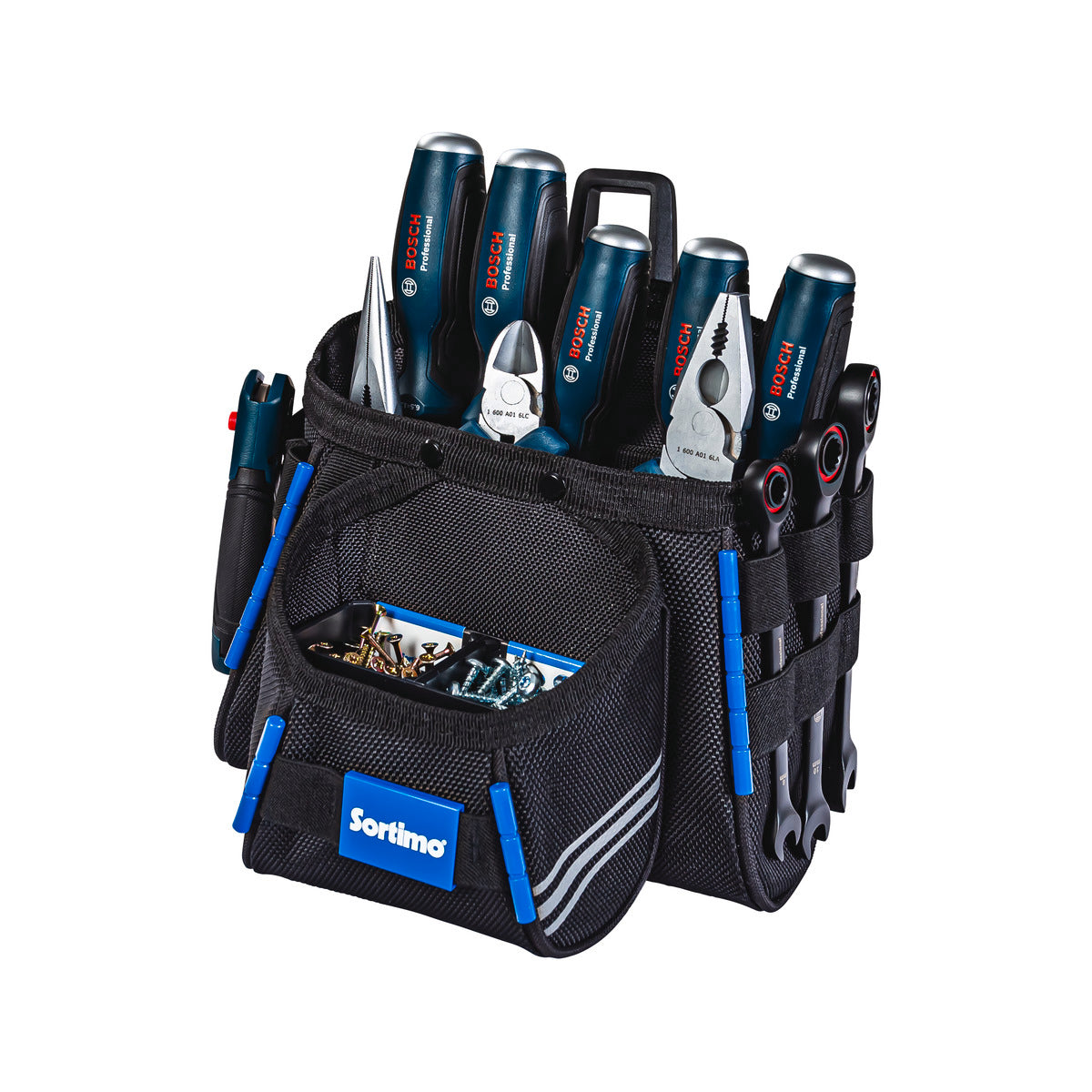 The ProClick system is a new product line for mobile working that incorporates itself seamlessly in the working day of every handyman and service technician. Developed by BS Systems, a joint venture between Sortimo and BOSCH, the , ProClick is a product line that allows you to carry tools and working materials directly on you using textile bags. It also teams up perfectly with the EcoSystem by Sortimo and BOSCH. In other words, it is compatible with a wide variety of existing Sortimo and BOSCH products - irrespective of the brand.Unlimited possibilities with one click: The patented system consists of two main elements: The ProClick Holder and the hook. When you bring the two items together there is a “click”, indicating that the hook has engaged and is fixed securely.The ProClick system is an ideal companion in virtually all situations in your daily working life, since the bags can be fixed both in the familiar Sortimo ProSafe holes as well as in the ProClick Holder, using the hooks. This means that the ProClick products can also be used as accessories in the van racking, and, looking at it the other way round, the van racking can be used as a practical storage system for the ProClick bags, which can be taken onto the site using the tool belt.In addition to the mounting options on the van racking, additional Sortimo products, such as the AutoAssistant and the C-BOXX also have mounts for the ProClick bags. They can therefore also be hung up here quickly, serving as extended storage.The ProClick bags are available in various different sizes and design. They are made from sturdy polyester (1000 den) and are fitted with practical dividers, loops and holders, so that tools and consumables all have their own fixed place and can be easily located.Particularly in combination with the tool belt, the ProClick bags offer a perfect overview of working materials, as opposed to trouser pockets, can be preloaded to suit the specific task at hand, and can be replaced quickly.The reflective strips on the sides improve visibility in the dark and offer additional protection - particularly in the dark winter months.(Pictures are similar, decorative material not included; shipping only within the U.S.)