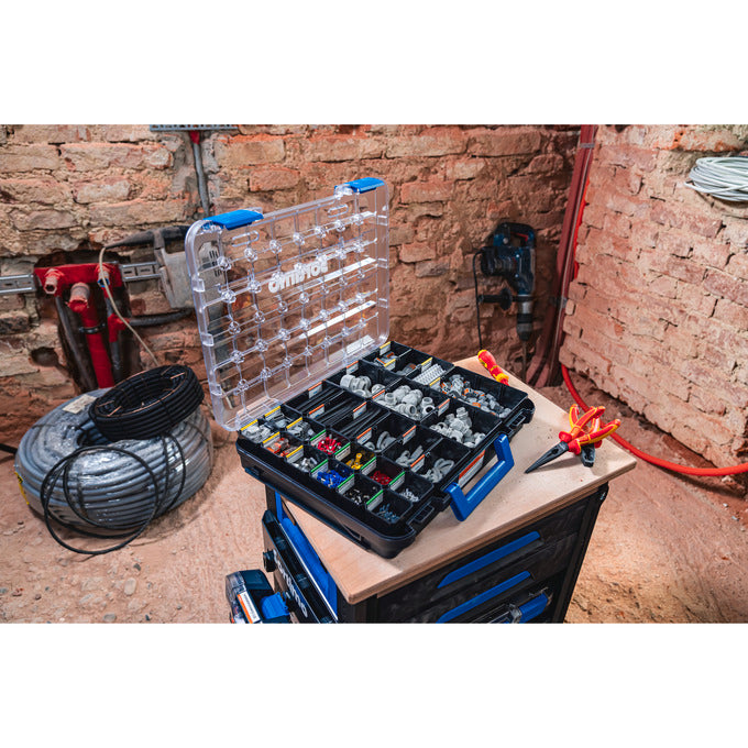 The Sortimo T-BOXX is revolutionising your working day. The transparent lid ensures that you can immediately see and safely transport all your small components. A special grid on the base and additional ‘crowns’ in the lid ensure that inset boxes are held securely in place to prevent their contents from becoming mixed up. Flexibly arrange the boxes as required and remove individual boxes at any time. However, T-BOXXes are more than just a practical organiser and transport system: they make you more efficient in your day-to-day work: you save time searching for materials and can also keep an eye on the stock levels of small components. Made of robust, lightweight plastic, T-BOXXes are impact-resistant and ideal for a wealth of uses. They are easy to use, thanks to their sturdy handle and the wide opening angle of the lid, which provides unrestricted access to your materials. T-BOXXes 320 and 330 can be seamlessly integrated into all Sortimo van racking systems and the WorkMo, ensuring the end-to-end transport of your small components from your store to your place of work. The compact T-BOXX 120, a new addition to the range, expands the product range and can be conveniently joined to the lid of the larger models.(Pictures are similar, decorative material not included; shipping only within the U.S.)