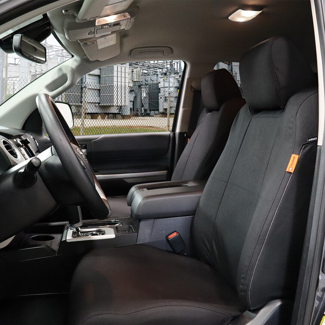 TigerTough seat covers for Toyota Tundra bucket seats. This set includes covers for driver and passenger seat backs, seat bottoms, and headrests.