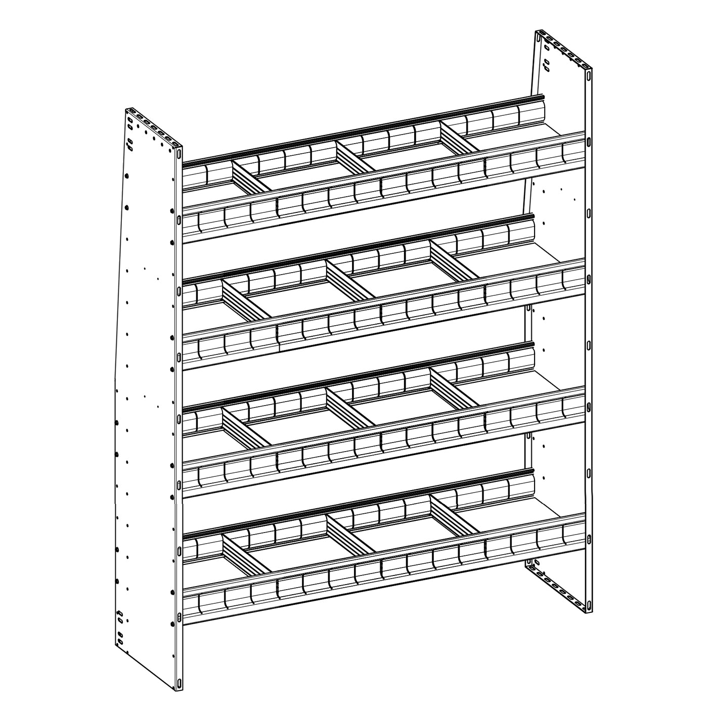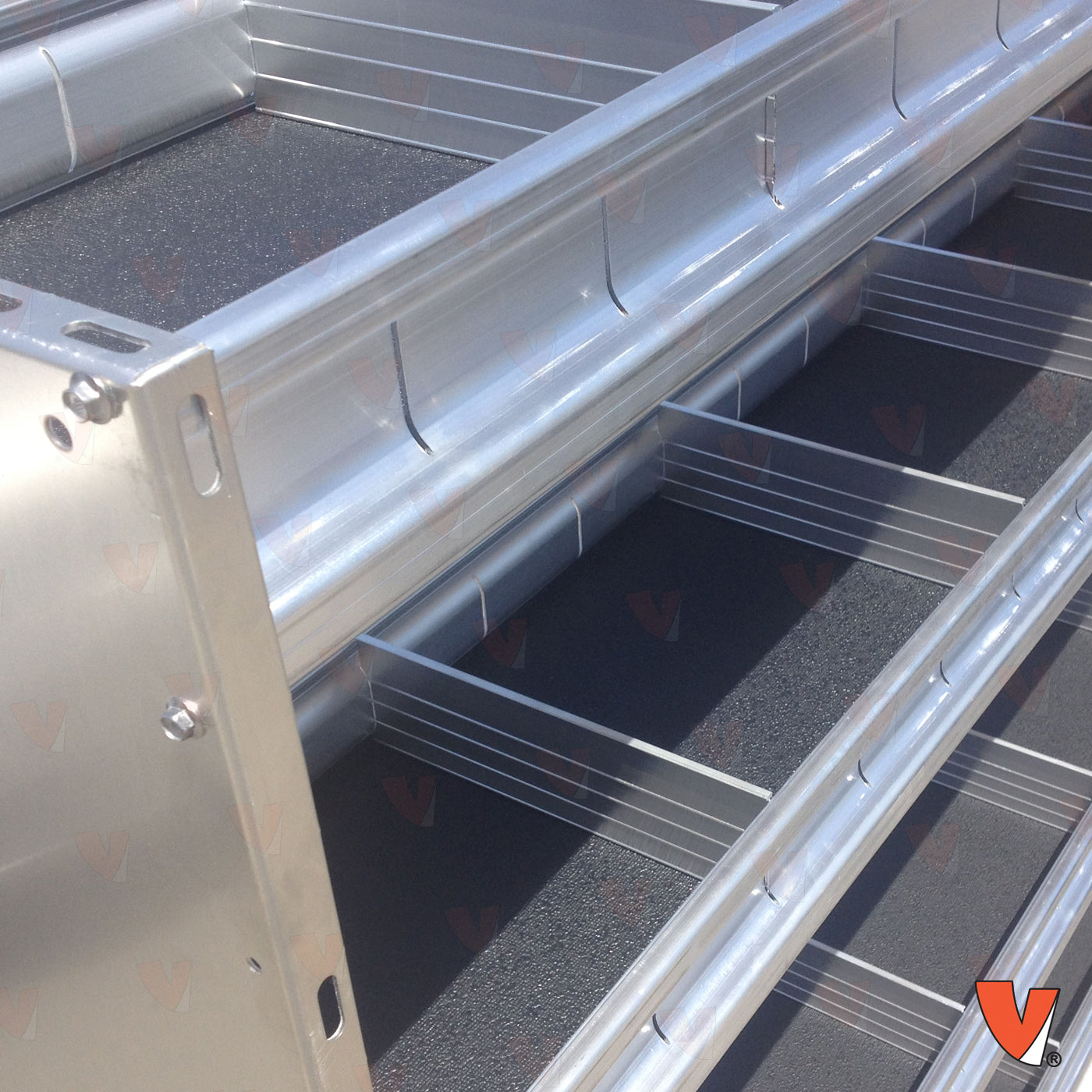 Lightweight aluminum cargo van shelves from Vantech. Constructed of aluminum with 1/2" plywood shelves wrapped in non-slip vinyl. Safely store and organize your tools, hardware, materials, and other items.