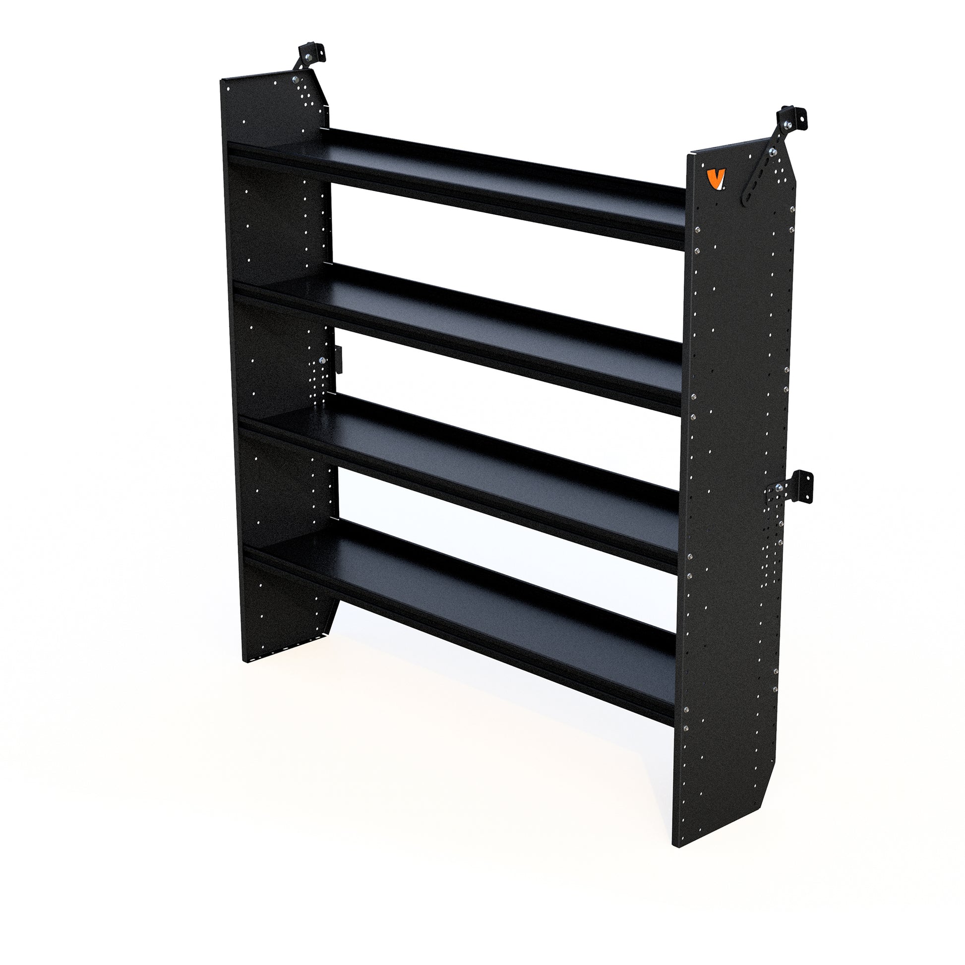 Lightweight aluminum cargo van shelves from Vantech. Constructed of aluminum with 1/2" plywood shelves wrapped in non-slip vinyl. Safely store and organize your tools, hardware, materials, and other items.