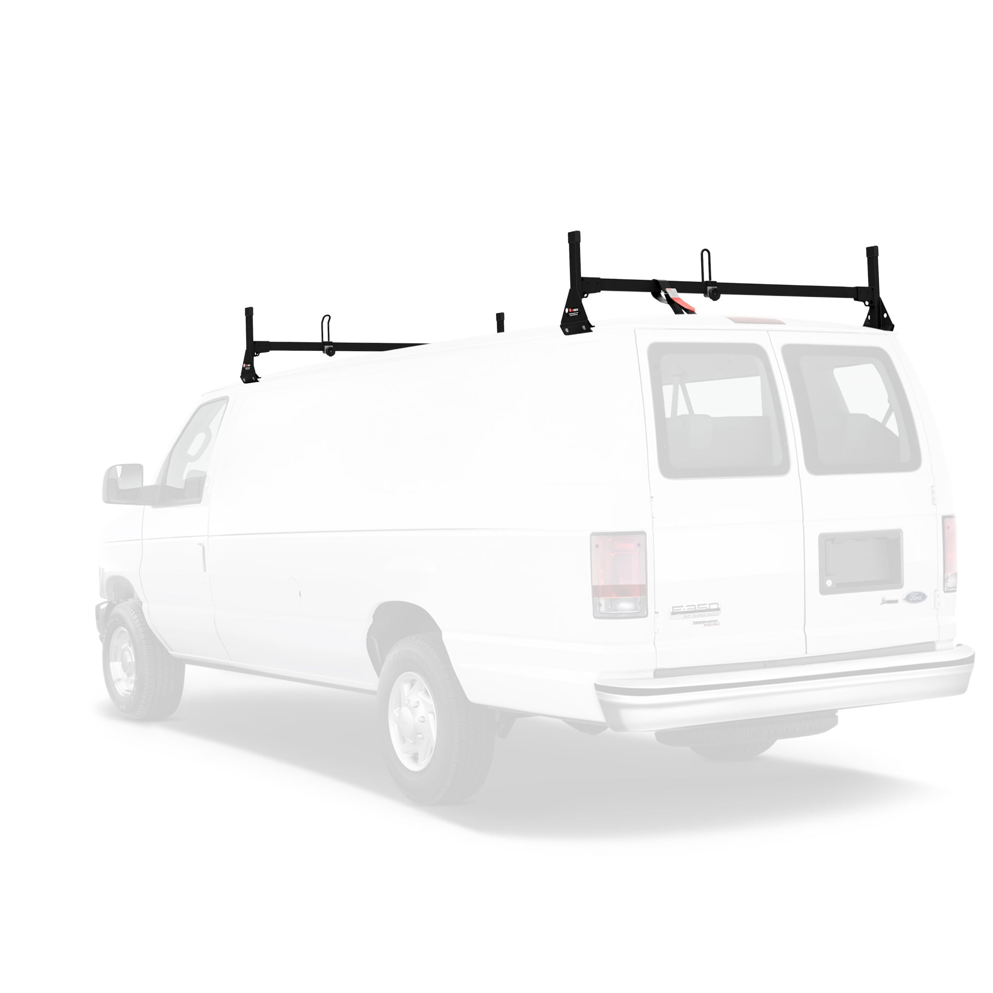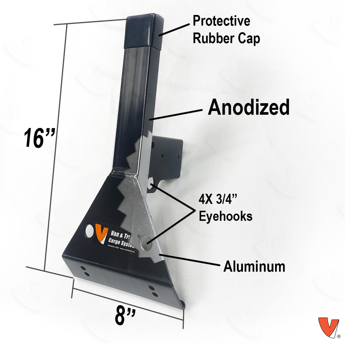 The Vantech H1 Aluminum System can hold up to 250 lbs. per cross bar. Each mounting base is made from 4mm thick 6061 aircraft grade aluminum. The Cross bar is protected by rubber bar guard on top. The aluminum mounting upright is approx. 1/8″ thick at the base. The Mounting uprights have an 8″ extra wide footprint. The height of the mounting upright stands at 16.5″ total height. The Triangular base plate is welded complete onto upright post for complete seal. There are 4X 3/4″ eyehook on each upright mounts. No drilling required for installation. This system comes with drip rail clamps to install onto the vehicle’s drip rails. The drip rail clamps are 11 gauge steel 2″ X 8″ dipped in rubber top and bottom. Rubber cap on the upright post prevents wind noise and prevent water from entering system. The accessories included are 2X non-slip rubber bar guard to protect the top surface of cross bars from wear and tear. 1X ladder stopper (5″ tall) to prevent ladder from sliding forward, Ladder stoppers are galvanized then rubber dipped. 1X ladder guide (5.5″ tall) for easy bungee and tie-down. Ladder guide & Ladder stoppers are galvanized then rubber dipped. Easy turn knob allows quick adjustments and removal or adjustment of ladder stopper and ladder guide. 1X hook & loop strap to secure ladders up to 75 lbs. quickly. This system is anodized black.