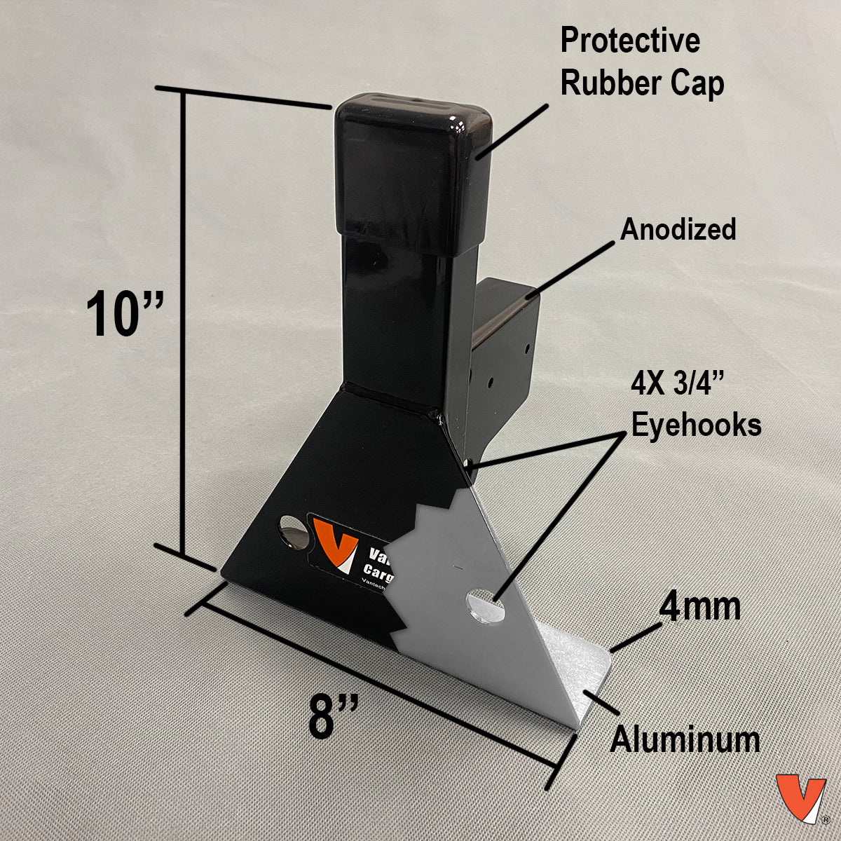The Vantech H1 system can hold up 250 lbs. per cross bar. The Crossbars is 2″ X 1″ reinforced extruded aluminum with built-in channels. The aluminum mounting upright is approx. 1/8″ thick at the base. The mounting uprights are 8in wide at the base and 10.25″ total height. The Base is welded complete onto the upright post for complete seal. There are 4 x 3/4″ eyehook per mounting upright There is absolutely No drilling required. Rubber cap on the upright post prevents wind noise and water leakage. The system Includes 5″ ladder stopper to prevent ladder from sliding forward, Ladder stoppers are galvanized and rubber dipped. The system also includes 5.5″ ladder guide for easy bungee and tie-down. Ladder guide are galvanized and rubber dipped. Easy turn knob allows quick adjustments and removal of ladder stopper and ladder guide. Hook & loop straps secure ladders within seconds up to 75 lbs.