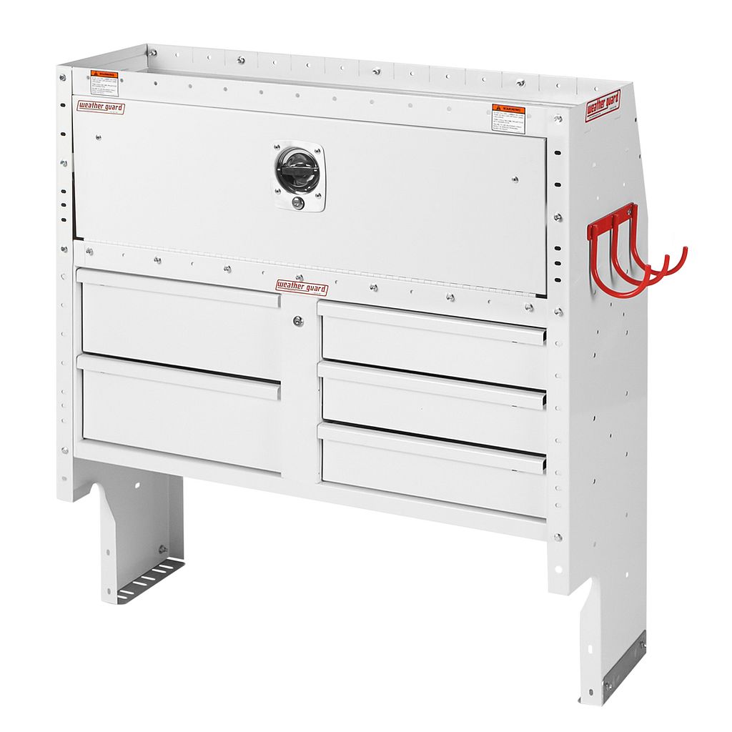 Designed for plumbers and cable/telecom installers, the Model 600-8112L van package for Full-Size, 148in wheel base Ford Transit vans provides adjustable cargo van shelving sized to fit the commercial van interior, a shelf door, a 5 drawer secure storage cabinet, and accessories. It includes a sturdy van bulkhead for maximum protection against shifting loads. Additional van products are available to create a custom van storage solution
