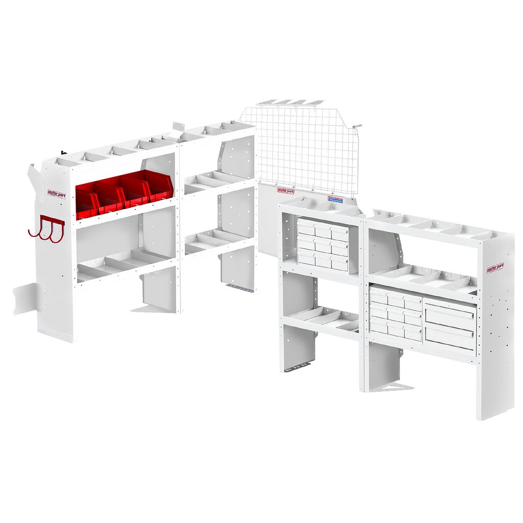 Includes everything you need for a complete upfit package, including bulkhead, driver/passenger side shelving, accessories, and installation kit all crafted specifically for your trade.