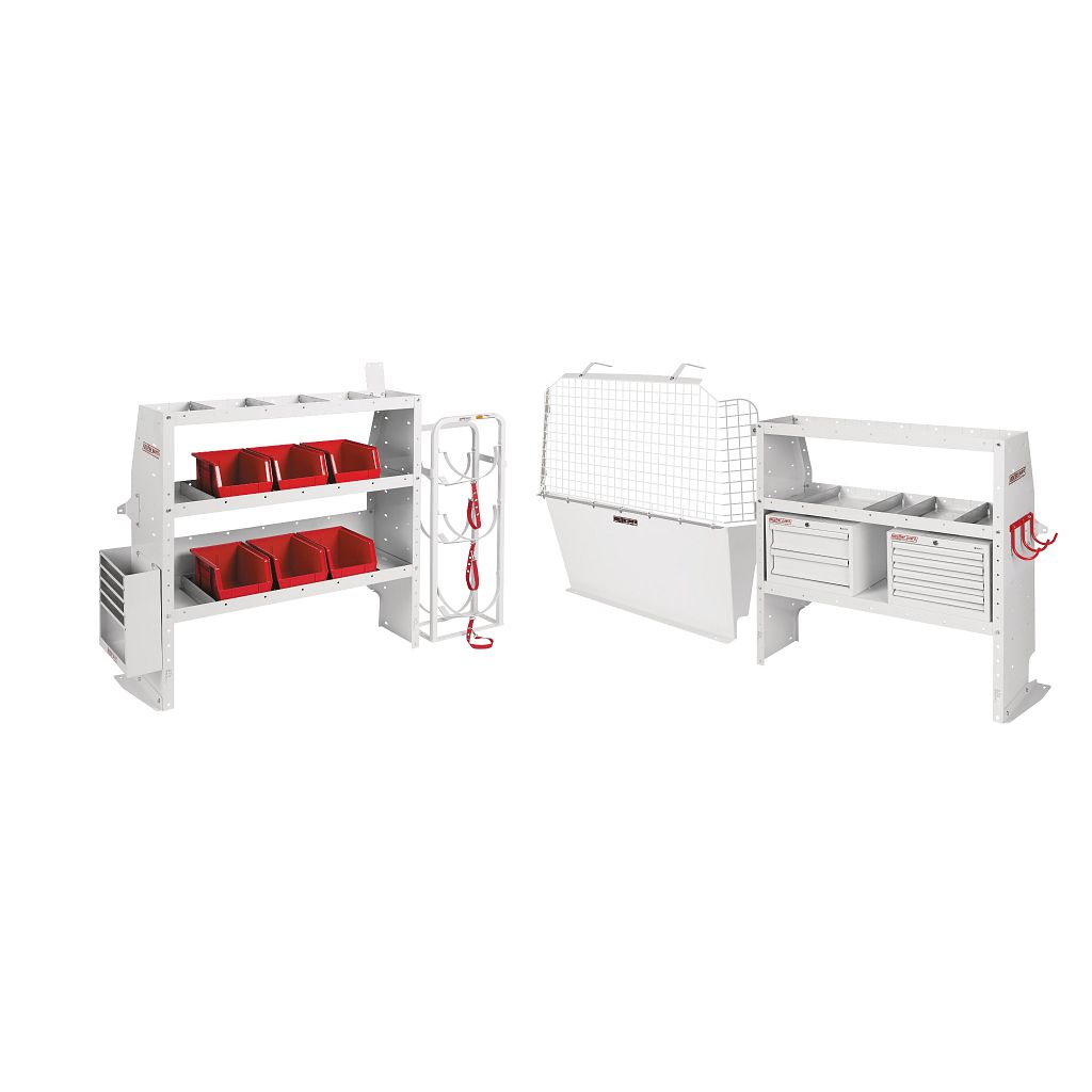 Includes everything you need for a complete upfit package, including bulkhead, driver/passenger side shelving, accessories, and installation kit all crafted specifically for your trade.