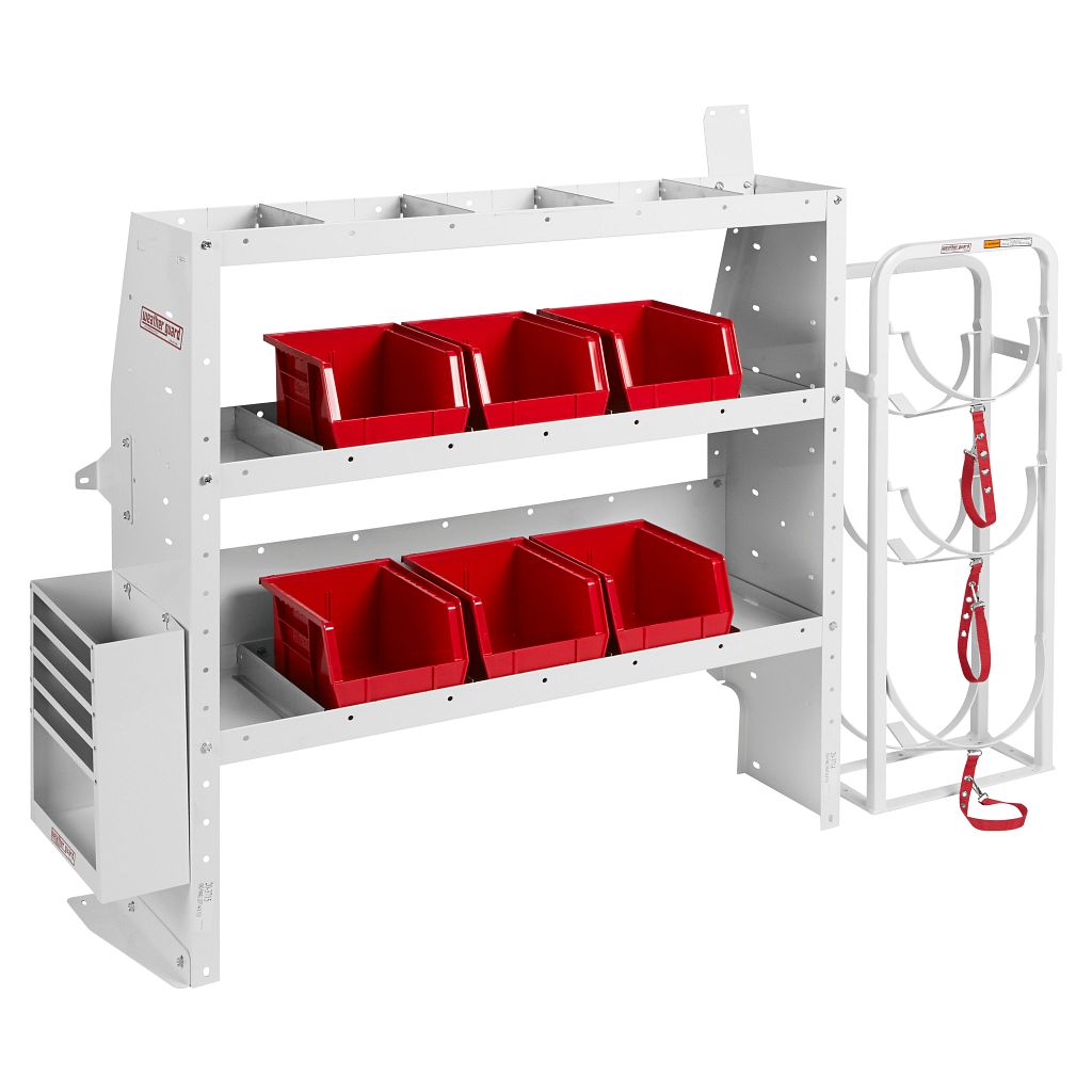 Designed for HVAC professionals and mechanical contractors, the Model 600-8353 van package for Mercedes Metris long wheel base vans provides adjustable cargo van shelving sized to fit the commercial van interior, a shelf door and a tank rack. It includes a sturdy van bulkhead partition for maximum protection against shifting loads. Additional van products are available to create a custom van storage solution