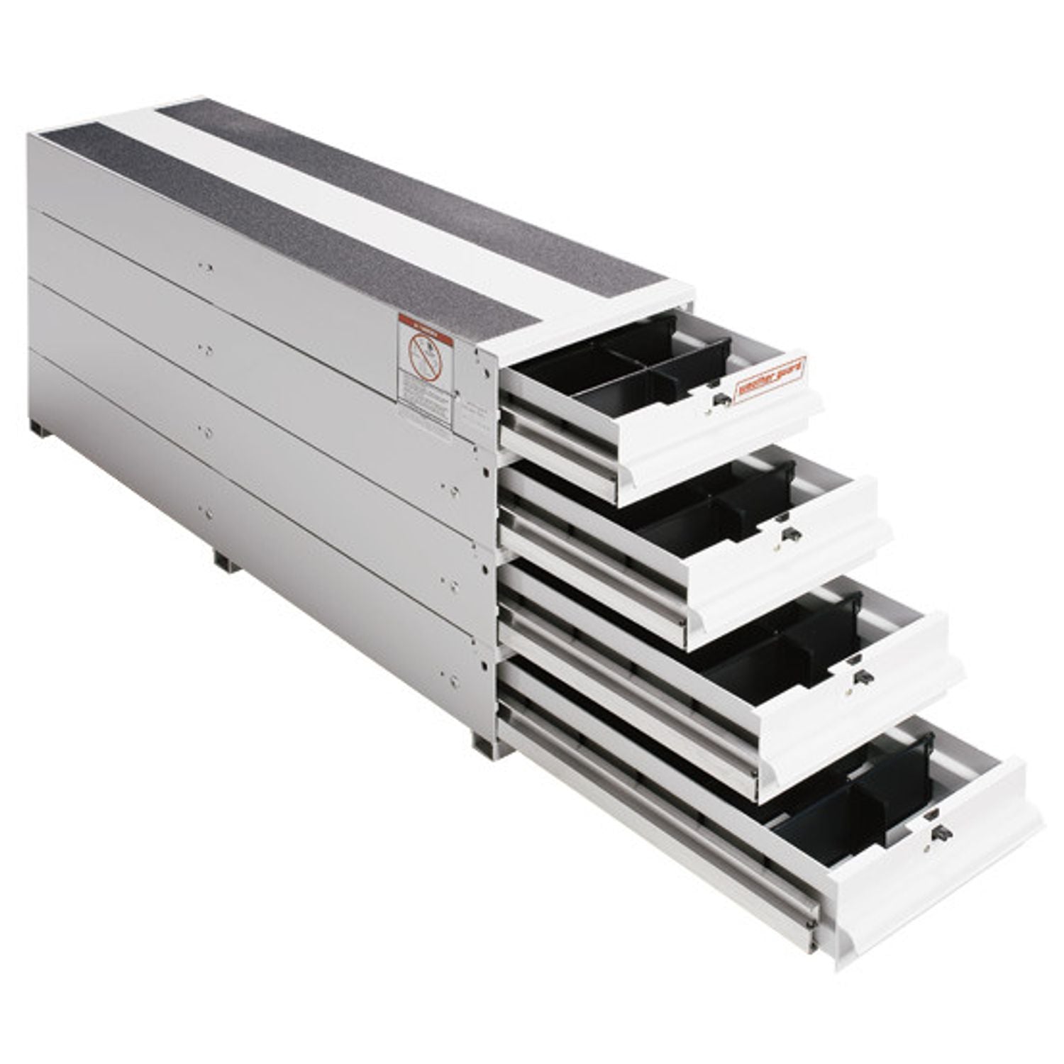 This lightweight aluminum truck bed storage and cargo van storage solution conveniently increases your storage space and places small equipment at your fingertips. The Model 328-3 is a quadruple stacked drawer unit measuring 49in long, 12.25in wide, and 23.5in high. The slide out truck bed tool box and cargo van tool box drawer dividers provide an extensive array of options for organization.