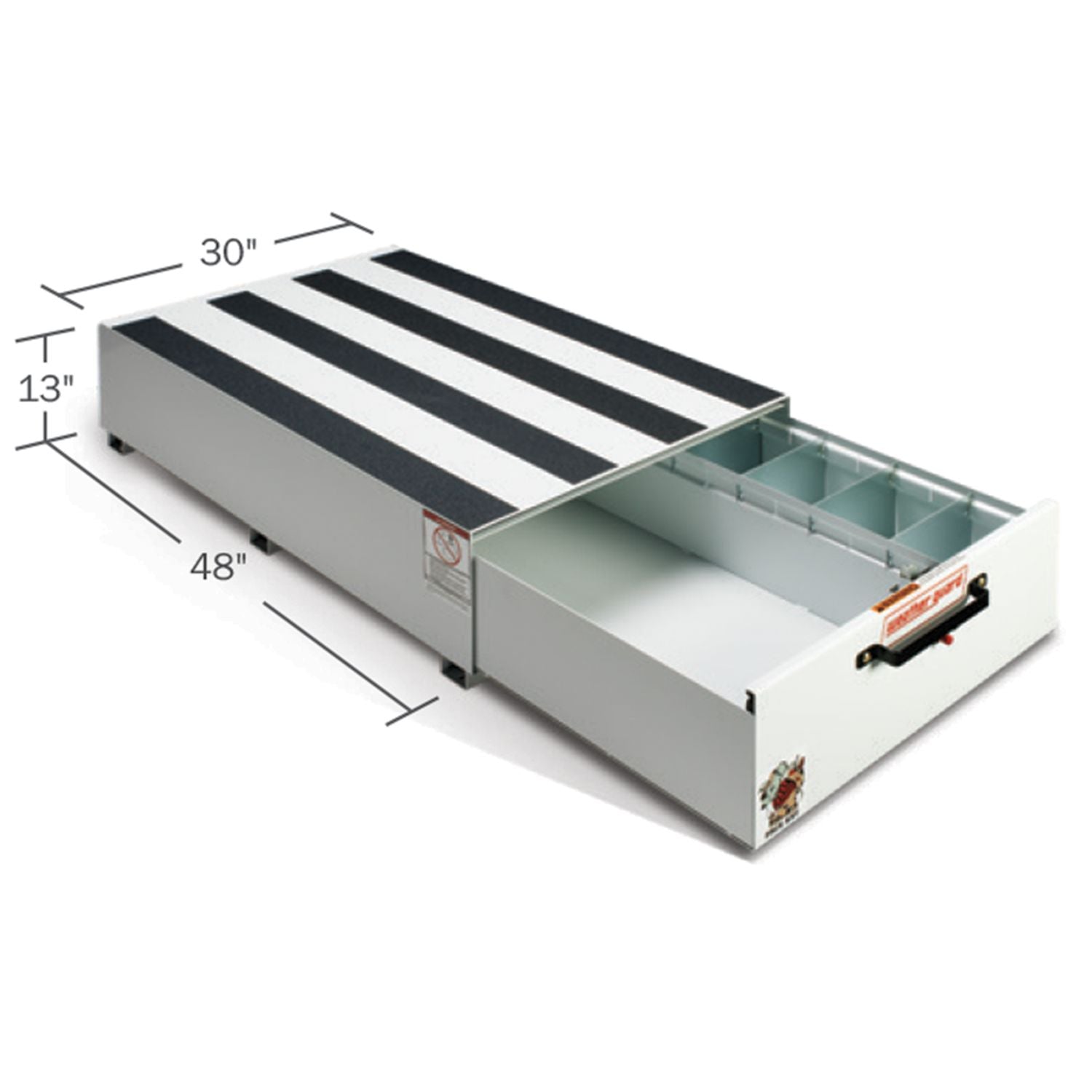 - Anti-skid strips provide traction for work boots on top of slide out truck bed tool box and cargo van tool box