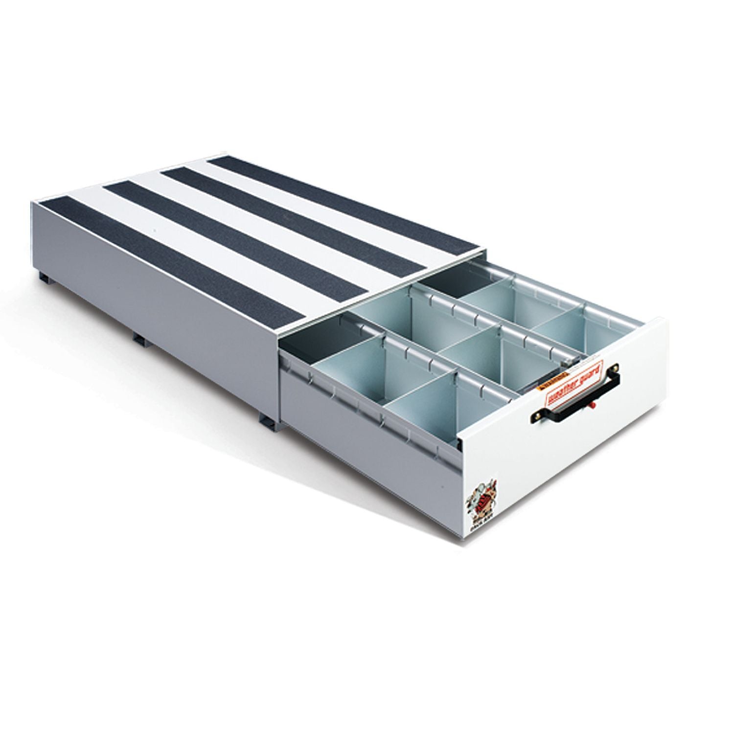 • Anti-skid strips provide traction for work boots on top of slide out truck bed tool box and cargo van tool box
